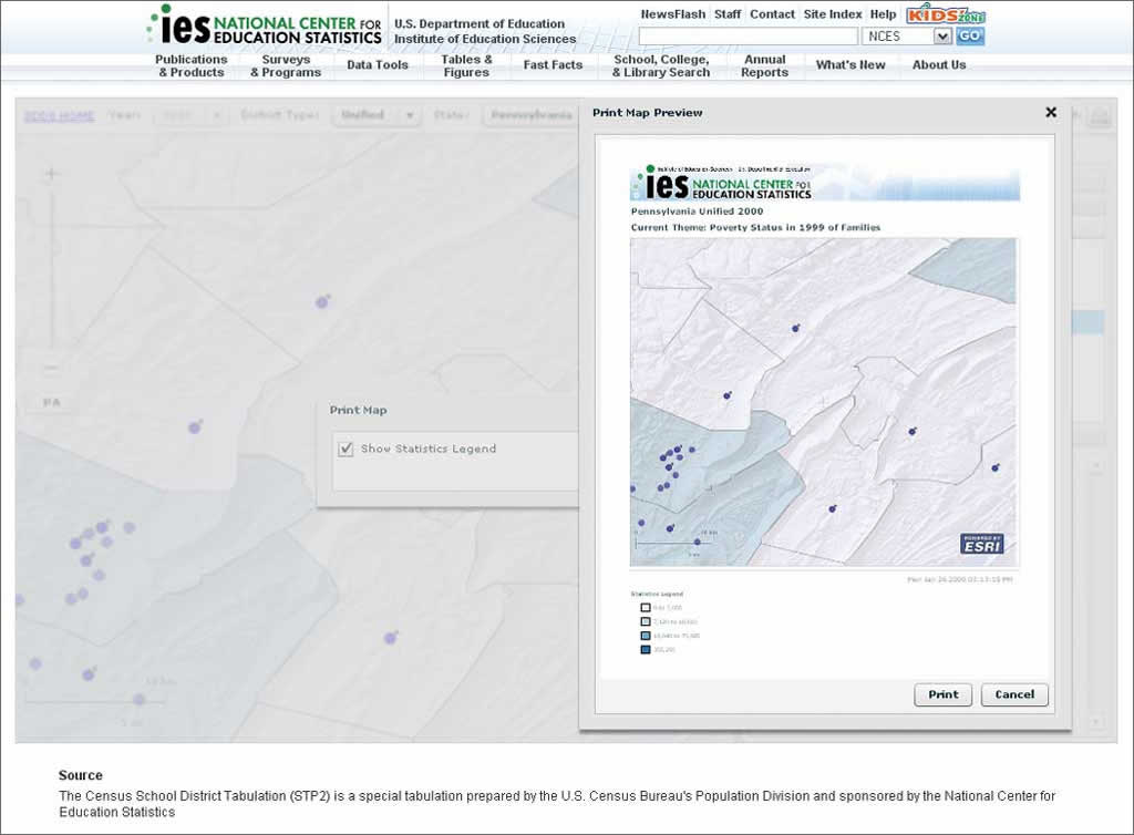 This site replaces a previous ArcIMS-based site. The new SDDS Web site supplies quicker access to more data and allows users to compare data among districts over time. Visitors to the site can view more detailed information at different scales. "ArcIMS met our needs in 2000, but we wanted to increase the speed of the site and our data uploads," said Tai Phan, program director of the Library Statistics Program at NCES. "Implementing the new technology of Adobe Flex eased customization for programmers and increased map-loading speed for end users. A huge benefit is that we can use this technology for four to five years without having to go through another customization. "The transition was smooth, and the number of hits to the site have increased each month," said Phan. "Before the transition, we averaged 21,000 hits to Map Viewer, and by November, we had 73,000 hits. The speed and features of the new mapping technology contribute to this increase." At the state level, the new site supplies choropleth maps that display demographic data such as population, housing, race, income, and education levels for each school district. At the district level, users can explore data on school district boundaries and individual schools. Users can also find data about revenue and expenditure sources that show how a school district is funded and what programs the district supports (e.g., Gifted and Talented, Bilingual Education, Vocational Education). NCES and the U.S. Census Bureau began collaborating on SDDS during the 1990 Census with the Census Mapping Project. During the decennial Census 2000, the Census Bureau provided 90 percent of the data and state governments provided the remainder to develop school district maps. This work led to a complete set of nationwide school district and demographic maps. The yearly addition of demographic data from the American Community Survey and better mapping tools have enhanced the functionality of the site. However, NCES determined it needed to better manage its geodatabase and improve the SDDS site's mapping tool, Map Viewer. Upgrading to ArcGIS Server increased the speed and flexibility of Map Viewer. Esri business partner Blue Raster LLC worked with NCES to develop the ArcGIS API for Flex version of Map Viewer. NCES will continue adding data to the site as it becomes available including the 2007 American Community Survey and the 2010 Census. The division already shares information with the Department of Homeland Security. In the future, tools that will assist police and fire stations when responding to emergencies will be added. One tool will allow first responders to quickly determine the distance to a school and the number of students and faculty that are on the campus. For more information on NCES's implementation of ArcGIS Server, contact Phan, program director, at Tai.Phan@ed.gov. To learn more about the ArcGIS API for Flex API, take the Esri free Web training seminar Building Rich Internet Applications with ArcGIS API for Flex. |