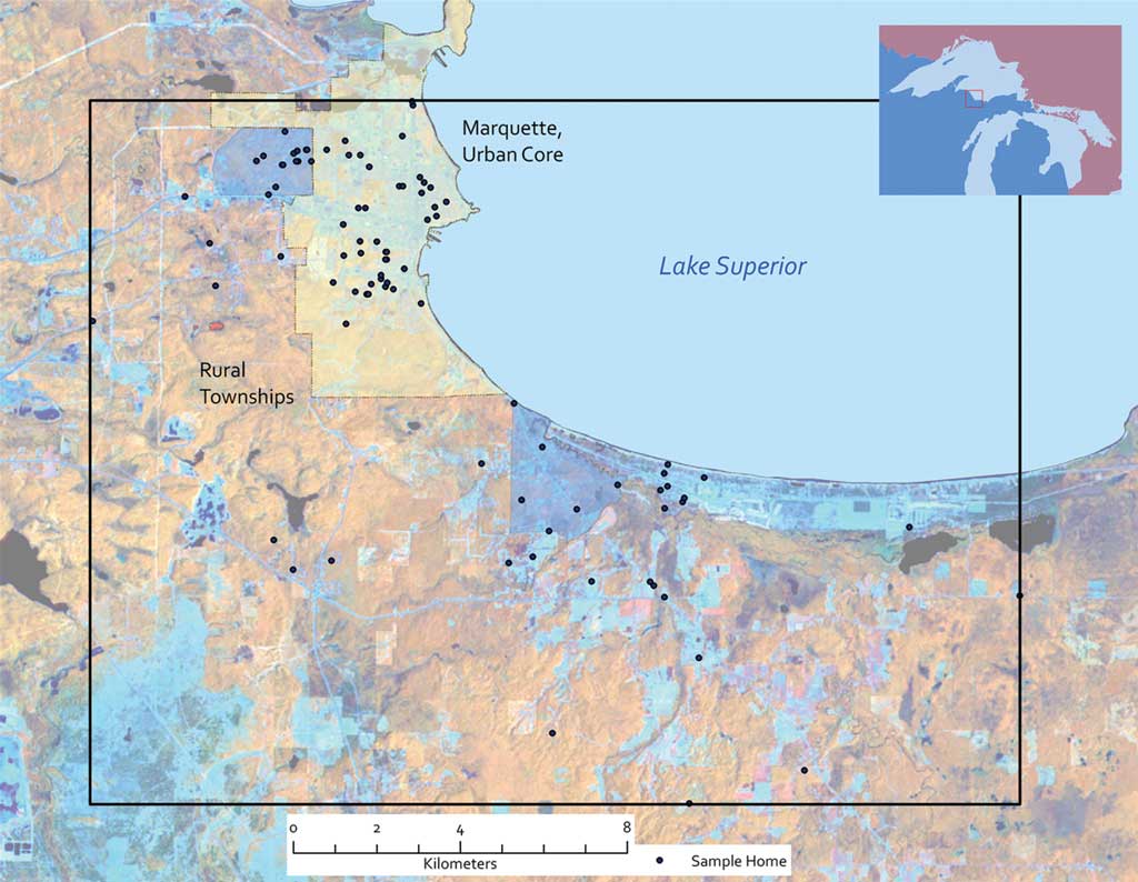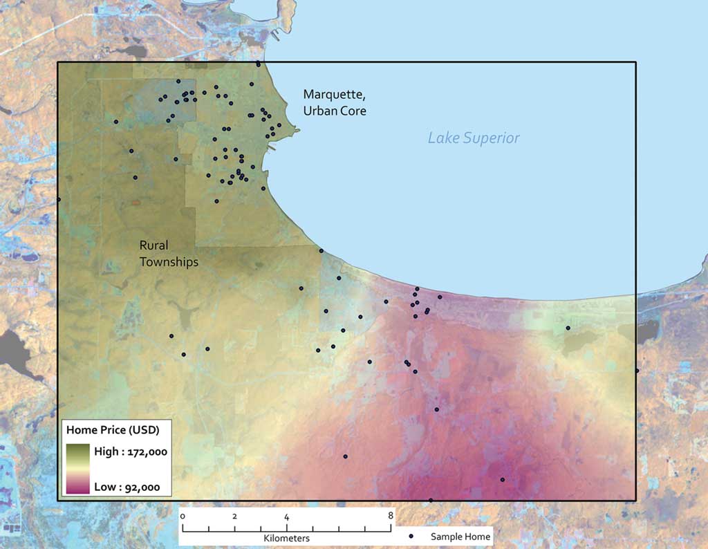 Underpinning geographic thinking is the assumption that spatial phenomena will vary across a landscape. Regression-based models largely ignore this assumption, much to the detriment of spatially varying relationships. However, ArcGIS 9.3 provides an exciting tool that generates spatially calibrated regression models. Known as Geographically Weighted Regression (GWR), this tool generates a separate regression equation for every feature analyzed in a sample dataset as a means to address spatial variation. (The GWR tool requires an ArcInfo, ArcGIS Spatial Analyst, or ArcGIS Geostatistical Analyst license.) To illustrate these concepts, students in a spatial analysis class at Northern Michigan University (NMU) analyzed the listed sales price for single family houses in Marquette, Michigan, based on location and several other related variables. Prior to the availability of the GWR tool, linear regression was applied to generate these models. Frequently, students found linear models to be limited because they would often overestimate the asking prices in some neighborhoods while underestimating prices in other neighborhoods. Applying the GWR tool was a way to improve modeling accuracy and ameliorate some of these residual errors. ApplicationTo calibrate this study, a sample of 93 homes listed on www.uprealestate.com in March 2008 was used. The coordinates for these houses were recorded in Universal Transverse Mercator (UTM) in North American Datum of 1983 (NAD83) Zone 16N. The listing price parameters included number of bedrooms and bathrooms, house square footage, and lot size. Because the number of bedrooms is closely linked with the square footage of the house, the number of bedrooms was excluded from further analysis. Initial linear regression analysis (entry method) was used for generating a global model predicting the listing price of homes in Marquette, Michigan. Using the GWR tool [found in the Modeling Spatial Relationships toolset in the Spatial Statistics tools in ArcToolbox], a spatially calibrated model was generated using the same dataset. The GWR tool gave separate regression coefficients for each of the 93 houses in the sample. These coefficients were mapped as raster surfaces, and the listing price of a common home (1,500-square-foot floor area with 1.5 bathrooms on a 38,400-square-foot lot) according to spatially varying regression coefficients was generated using the GWR tool in ArcGIS. ResultsWhile the linear regression model was found to be signifi cant and had a strong R-squared value of 0.782 (p = 0.000), the GWR model improved on these statistics and increased the model's accuracy to an R-squared value of 0.865 (p = 0.000). [R-squared is a measure of goodness of fi t. Its value varies from 0.0 to 1.0. Higher values are preferable. See the accompanying article, "Regression Analysis ComponentsTerms and basic concepts" for more information on these terms.] In addition, the range in residual value error decreased by $160,000 when using the GWR model instead of the linear model. The coefficient surfaces generated using the GWR tool were also helpful for identifying the spatial patterns apparent in the study area. For example, the lot value coefficients indicate that as lots are located nearer the urban core and farther from the rural townships, lot square footage price increases. In contrast, coefficients suggest that the larger the house, the less it contributes to the listing price (again, as properties are located nearer the urban core and farther from the rural townships).