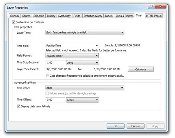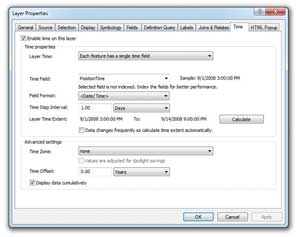The full time extent is set to the time extent of the Hurricane Ike map layer. The Start and End times have automatically been set to match the first and last position reported in the map layer. In the example, it is switched to the Time Display tab. Because the position reports are spaced about six hours apart, set the time step interval to six hours and close the Time Slider property page.