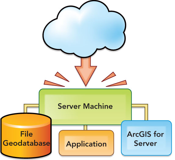 A common method for deploying a mapping application is to put everything—the mapping application, the GIS server, and the data—on one machine.