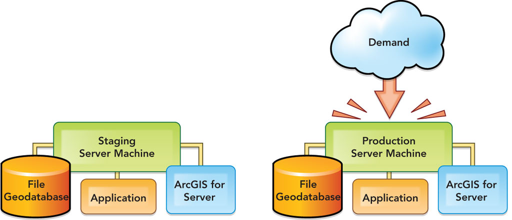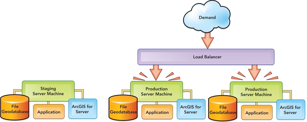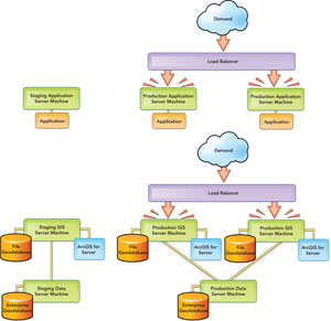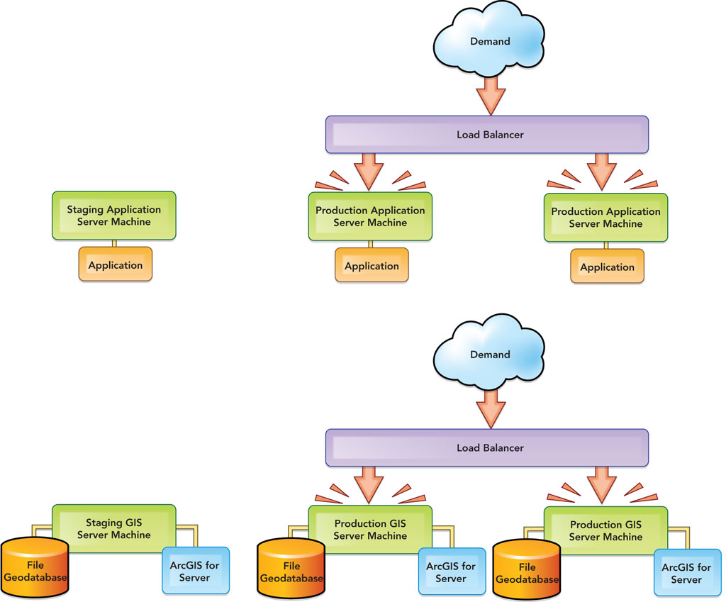 To support a high-capacity mapping application, you will need a scalable system of identical setups, each with a GIS server; an application; and, possibly, data server machines. If you want to maintain your system in a manner that minimally impacts your end users, consider creating a staging AMI that you can work on while the production AMIs serve your end users. Ideally, there should be two load-balanced production instances in the base structure of the system so that if one fails, the application remains viable. If demand on both production instances exceeds tolerances, another production instance can be manually or automatically added to the load balancer.