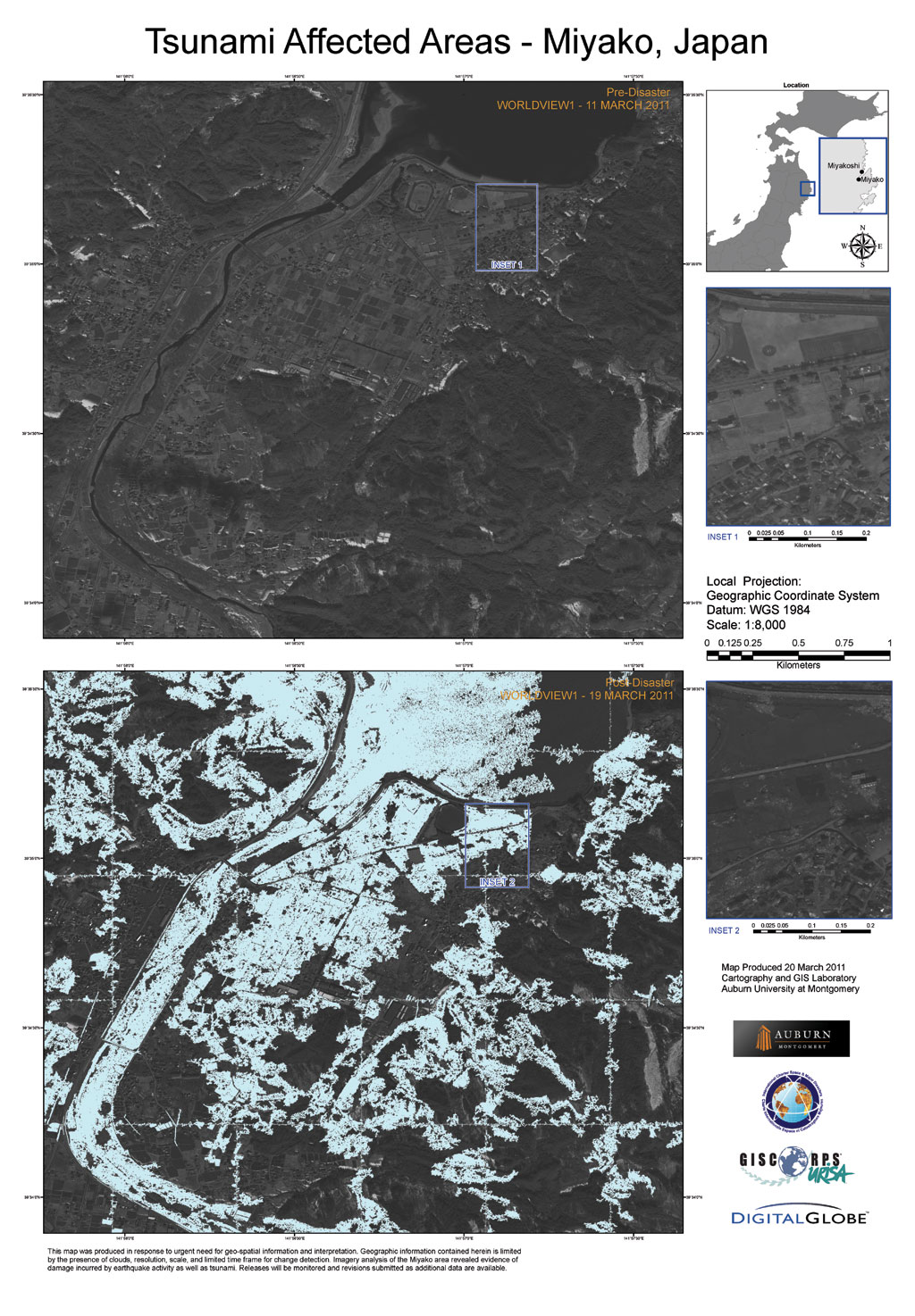 When a major disaster strikes, the International Charter on Space and Major Disasters takes effect. This charter, first initiated by the European Space Agency, provides space satellite data to relief organizations responding to these events. The US Geological Survey (USGS) was as part of the US team of signatories to this charter. USGS, working through GISCorps, an organization composed of GIS professional volunteers, requested help processing and analyzing imagery from Japan. Winemiller, along with Christopher Blair and Sissy Speirs, two student assistants who gave up other plans for their spring break, volunteered, and AUM became one of four universities in the United States that helped process and analyze imagery related to the disaster.