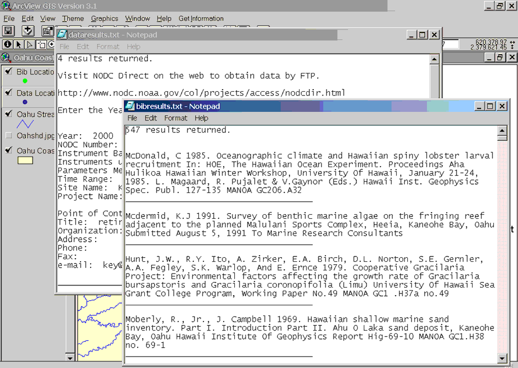 For the purposes of this demonstration project, metadata from selected environmental studies performed on Oahu were provided by the National Ocean Data Center (NODC). Information on obtaining these datasets is readily available from the NODC Web site. Access information is automatically provided in the header on ArcView 3.x reports generated for metadata sets.