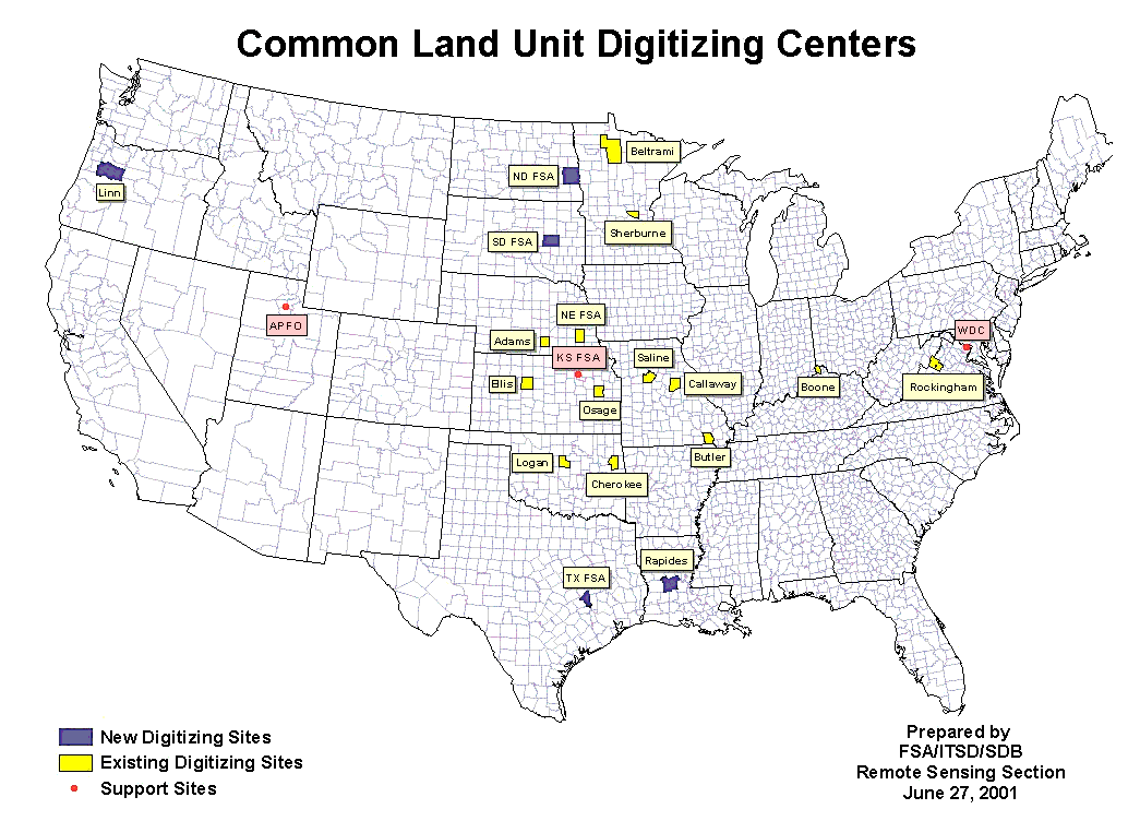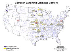 By January 2000, 13 digitizing centers were established at field office locations in seven states. These offices are developing the CLU data layer using ArcView 3.x with customized digitizing and quality control extensions developed for the project. FSA proposes completion of the CLU layer for the entire country by fiscal year 2005, if not sooner.
