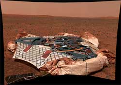 After the landing site points are plotted, zoom into the Spirit landing site. Notice the white area under the lander's location. Another white area is northwest of the Spirit lander. The white mark, near the middle of the image, is actually the lander. The northwest white area is the parachute and backshell that detached from Spirit during descent. Also notice the dark scar on the rim of the crater to the northeast. This is believed to have been caused by the impact of the detached heat shield, which was also released during descent. The highest resolution image for the Opportunity lander site is called 01_overview_nolabled-B016R1.jpg. This MOC image has a resolution of 1 meter per pixel and contains the white pixel marks showing the lander (left of middle in the small crater) and the parachute and backshell near the western edge. The heat shield scar is in the southeast in the image and directly south of the large crater. This image is courtesy of NAS/JPL/MSSS. The accompanying illustrations show examples of the final maps for both sites. Have fun exploring the landing site areas and compare these views to images sent from the actual Mars rover landing sites. For more images and information about the Mars rovers, visit marsrovers.jpl.nasa.gov. For planetary GIS information, visit the USGS Planetary GIS support site (aka PIGWAD) at webgis.wr.usgs.gov/. For more information on this tutorial, contact Trent M. Hare, Computer/GIS Specialist About the AuthorTrent M. Hare, a computer/GIS specialist with the U.S. Geological Survey Astrogeology team since 1994, received a bachelor's degree in computer mathematics from Northern Arizona University. He has also taken additional course work in ArcIMS development, digital photogrammetry, and ArcInfo. He is currently involved in ongoing projects with NASA Planetary Geology and Geophysics, Mars Data Analysis, and other research programs developing GIS Web sites for planetary datasets. His work on the Mars 2003 landing site selection involved writing code specifically designed in ArcView to help generate landing ellipses for targeting the rover's descent. He has also designed and written tools in C++ for photogrammetric and remote sensing software using Viking, Clementine, Pathfinder, and Magellan datasets; created virtual reality modeling language (VRML), image, and DEM importers and exporters as well as provided other USGS projects with GIS and programming support. As part of his work with global 1:1 million datasets, he developed a GIS interface and specialty routines and compiled the datasets. His customized ArcView interface let non-GIS users easily generate maps. He also managed the database creation for a GIS project to compile geologic maps of China. Hare designed the Titan Swath Viewer (TSV) in ArcView for the Cassini satellite and customized the ArcView interface so that novice GIS users could test different satellite targeting scenarios. Resources