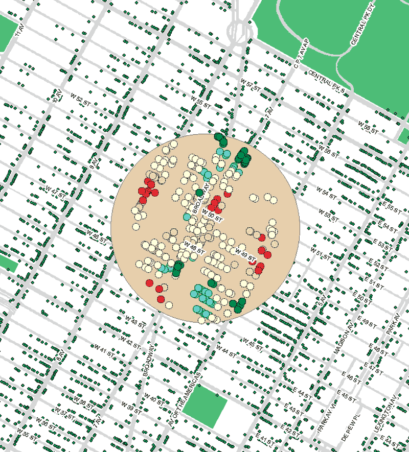 Figure 2 shows a simple model illustrating how the ArcGIS Hot/Cold Spot Analysis tool was used for this analysis. This model geocodes the address of the building in question, then buffers that location by one-quarter mile (assuming all employees can travel that far). It clips a business location dataset that contains the area's daytime population by business address. Using this dataset, the model runs the Hot/Cold Spot Analysis tool to find statistically significant hot and cold spots for building employees.