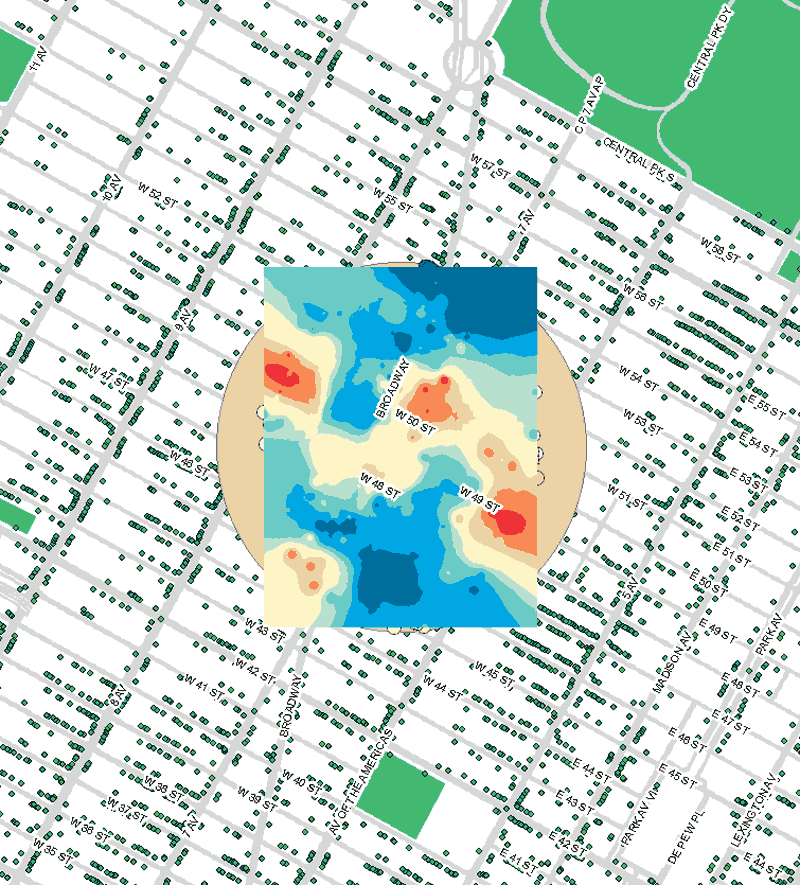 | Figure 4: Potential evacuation meeting points within one-quarter mile of the office were used to generate this surface. |