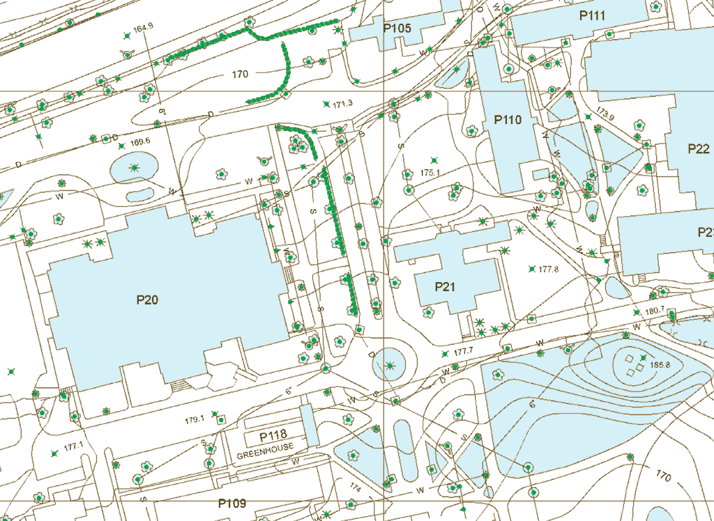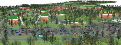 The two-foot interval contour lines provided detailed base elevation information for the entire campus. The contours were converted into a triangulated irregular network (TIN) to create a smooth, continuous surface across the campus. To create the TIN, the contours were used as mass points and the campus boundary polygon was used as a hard clip line in the triangulation process. The resulting TIN honors z-values on the contour lines; uses spot elevations (that were represented as two short, crossed line segments on the contour layer in the AutoCAD drawings); and does not extrapolate z-values outside the edge of campus where detailed elevation data was not available. Roads and sidewalks were mapped as polygons rather than lines to control the width of the roads. This also allowed surface textures, such as asphalt and concrete, to be applied in ArcScene. Parking lots, buildings, and forested areas were also mapped as polygons. Initially, these five polygon layers were symbolized with appropriate textures and colors and overlaid on the TIN on which a grass texture had been applied. However, when using this method, portions of the grass-textured TIN bled through the other polygon layers that obtained base height from the TIN. The result was that odd patches of grass appeared in places such as in the middle of a parking lot where they were not actually present. This occurred even if the parking lot polygons were offset from or extruded above the TIN. Because nearly every feature that wasn't road, parking lot, sidewalk, forested area, or building on the campus was grassy lawn, a land use/land cover layer was created that assigned all areas on campus to one of these six categories. This eliminated the display of random, phantom grass. Also, sharp edges could be displayed between adjacent features by offsetting one feature type with respect to another. For example, the roads and parking lots were offset by 0.3 meter (or approximately 1 foot) from the sidewalks, grassy areas, and forested areas to create a discrete white break between the two. In essence, this process created a virtual curb one foot high. By mapping the forested areas as polygons, points representing individual trees could be generated at random locations within the polygons. In this model, points were generated using a dot density display in ArcMap and exported as a point shapefile using a script obtained from the Esri knowledge base. Virtual forests for this campus were created using four different point files, each with a different dot density. This resulted in random point placement and the ability to use four different types of trees that produced forests with more variety: different species, sizes, and colors of trees. It was important for some point features to be oriented in a particular direction. For example, the bus stops had to face the street. To achieve this, a rotation field was added to the attribute table, using 0 to 360 degrees as the value range. Rotation values were entered for each feature that needed adjustment and used to rotate the objects in ArcScene. To give the buildings height, they were extruded based on height values from the attribute table. To capture the varying colors of the exterior walls, trim, and roofs of the buildings, two more copies of the buildings shapefile were added to the ArcScene project. The three identical building layers were then offset vertically so they would be layered on top of each other. The extrusion values for each copy of the shapefile were also adjusted so the buildings would retain their correct height. The polygons were then symbolized with colors, based on exterior color values from the attribute table. The resulting variations of colors match the general exterior colors for each building on campus. Continued on page 2 |
