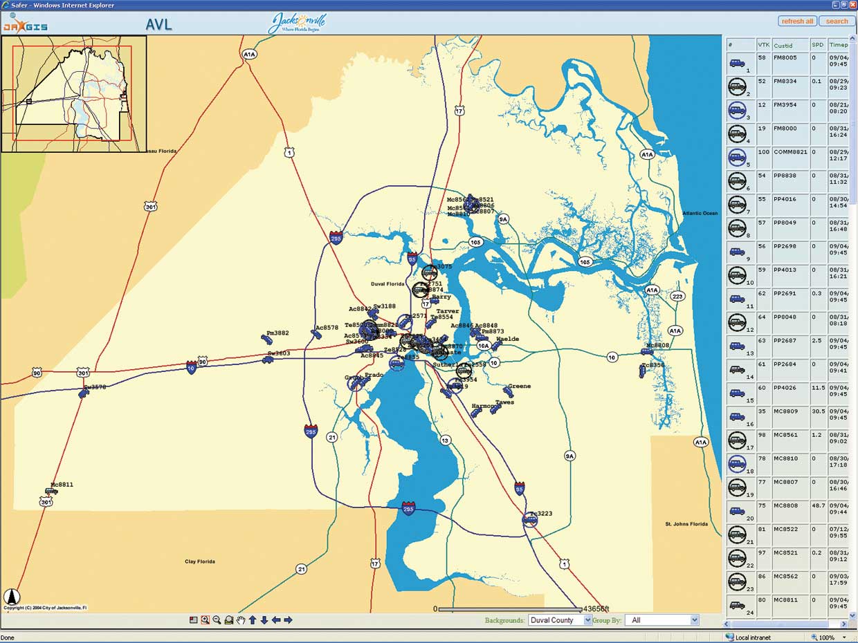 The JAXGIS executive Map Board system is a rapidly growing program of online mapping applications. In addition to the CARE Solid Waste Complaints Status Dashboard, the program includes the Debris Dashboard. This application tracks the full life cycle of debris collection and post-hurricane cleanup. As part of Jacksonville's overall hurricane preparedness and recovery efforts, it helps the city comply with Federal Emergency Management Agency (FEMA) regulations by ensuring the appropriate tracking of debris collection. The program maximizes the city's opportunities and eligibility for FEMA reimbursement funds. The Auto Vehicle Locator (AVL) Dashboard lets fleet managers track mobile assets throughout the county and monitor vehicles' locations, speed, and routes. By looking at the map, managers can tell when the vehicle is off or on, which street sweepers' brooms are up or down, which trash truck compactors are activated, or when fuel trucks' pumps are engaged. Program administrators report that the AVL Dash Board is improving the efficiency of vehicle resource allocation, helping with vehicle maintenance scheduling, and giving them the information necessary for optimizing service routes. JAXGIS provides the City of Jacksonville and Duval County with additional ArcIMS-powered dashboards for monitoring mosquito control, animal management, incident reporting, and tracking the loss of library books caused by storm damage. Making a Connection with ResidentsOver the last two years, JAXGIS has developed a series of public-facing ArcIMS Web sites that connect Duval County residents to their local government. My Neighborhood, one of the most popular sites, allows visitors to find a parcel by searching on a house number or property owner's last name and generates a detailed map and a comprehensive list of neighborhood amenities such as solid waste pickup schedules, contact information for the nearest schools, libraries and parks, and links to local representatives from the city council to Congress. Dozens of GIS layers, ranging from hospitals to voting precincts to two-foot aerial imagery, can be added to the map.