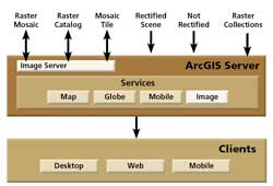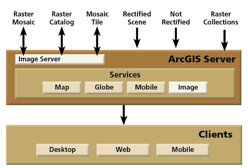 | ArcGIS Server and the ArcGIS Image Server extension acquire, manage, process, and serve imagery data from many sources to clients on the desktop, Web, and mobile devices. |
