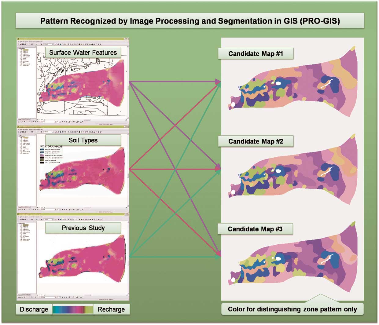 For example, recharge and discharge are known to relate to surface water features, soil types, land use, and topography. However, there is no deterministic function to delineate these relationships. The current version of PRO-GIS implements three image processing methods using different approachesthe 2D Moving Average, normalization, and TVL1 Low Pass Filter. The 2D Moving Average directly inherits several functions from Generalization ArcObjects in the ArcGIS Spatial Analyst extension. These ArcObjects include FocalStatistics and BlockStatistics including their statistical options of Majority, Maximum, Median, Minimum, Minority, Range, Standard Deviation, and Variety. The width and height of the moving window for averaging computations can be specified in the corresponding text boxes. A larger moving window usually generates a smoother image but requires more computation time. Normalization implements traditional algorithms based on existing FORTRAN code. This option transforms the original input data to a normal distribution, which is helpful in reducing the skewness. TVL1 Low Pass Filter was adapted by modifying a new algorithm, Total Variation Regularized L1 Function Approximation, which has applications such as medical magnetic resonance imaging (MRI) scan analysis. It minimizes the total variation of the image subject to preserve pattern edge with simplified computational parameter selection, minimal signal distortion, and the flexibility to extract variable degrees of spatial details. There is an option for Including Normalization and Back Transformation in the TVL1 option to transform the original data into a normal score before the TVL1 process and then back transform to the original range. This is an option to preprocess a dataset with a small number of extreme values and keep the resultant data range in the same scale as the original data range. In the future, developers will be able to use similar approaches demonstrated in these three methods to expand the capabilities of PRO-GIS and tailor the application to the needs of each individual project. GRADE-GIS MethodologyPRO-GRADE includes (but is not limited to) a default recharge and discharge estimation tool (GRADE-GIS) that uses a finite difference mass balance approach for two-dimensional steady state conditions. GRADE-GIS only requires hydraulic conductivity, water table, and bedrock elevation input raster files, which are synchronized ahead of time in coordinate projections, grid size, and grid number. It generates cell-by-cell recharge and discharge rates in a raster file, which is automatically synchronized with input raster files. The output raster file of recharge and discharge rates from GRADE-GIS is format-ready for PRO-GIS, which can perform further pattern recognition to identify the recharge and discharge zones. The coupling processes of using GRADE-GIS and PRO-GIS can provide a fast initial estimate prior to planning labor-intensive and time-consuming field recharge and discharge measurements. With the ArcGIS platform, the resultant recharge and discharge maps from PRO-GRADE can be cross analyzed with ancillary field information, such as land coverage, soil type maps, surface water distribution, and topographic slope, that has a direct but unquantifiable relationship with recharge and discharge. Real ApplicationsThis new approach has been tested using the dataset from the Buena Vista Groundwater Basin, a thoroughly understood system in the Central Sand Plains of Wisconsin. The coupling processes of using GRADE-GIS and PRO-GIS enable users to generate as many alternative recharge and discharge maps as necessary within minutes or hours. Users can compare alternative maps with external information in GIS and prioritize alternatives. Prioritized recharge and discharge maps can be used as an initial guideline for field study planning and decision making or can be used as initial conditions for numerical simulation and parameter estimation for more detailed analysis. PRO-GRADE is currently being used for several studies including an ongoing assessment of the water resources of the 11 counties in northeastern Illinois.
