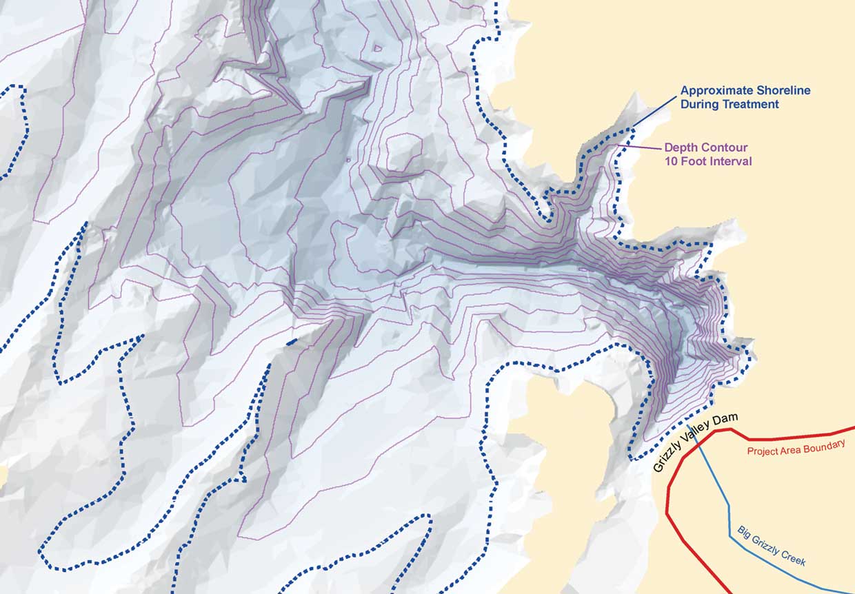 Separate reservoir and tributary stream map atlases were produced in hard-copy format and given to field crews ahead of time so they could become familiar with areas they were assigned to treat. ArcView 3.x was used to create the atlases because it can create multiple map layouts from multiple views. The atlases included area overview maps and individual maps for each quarter-mile grid. Many of the maps used digital raster graphic (DRG) topographic maps draped over current aerial photographs. The ArcView 3.x DRG Tools extension obtained from ArcScripts (www.esri.com/arcscripts) was used to isolate particular topographic map features and make the rest of the map transparent so that the aerial photographs could be seen underneath. In the stream map atlases, the aerial photographs were printed on regular paper, and the topographic map features were printed on transparent overlays. This approach allowed the stream field crews to clearly view the aerial photographs by themselves or in combination with the topographic map features. Field Surveys and NavigationFor several years prior to the 2007 project, GPS units were used by stream field crews to survey their assigned areas and map existing and potential locations (wet areas) to be revisited for treatment. During the treatment phase, GPS was used by field staff for navigation to assigned treatment areas and by emergency medical technicians, fish disposal crews, and other project staff for general locational reference. Particularly sensitive habitat areas along with potential habitat for threatened species were also identified using GPS and flagged in the field so that they would not be disturbed. Bathymetric Data Analysis