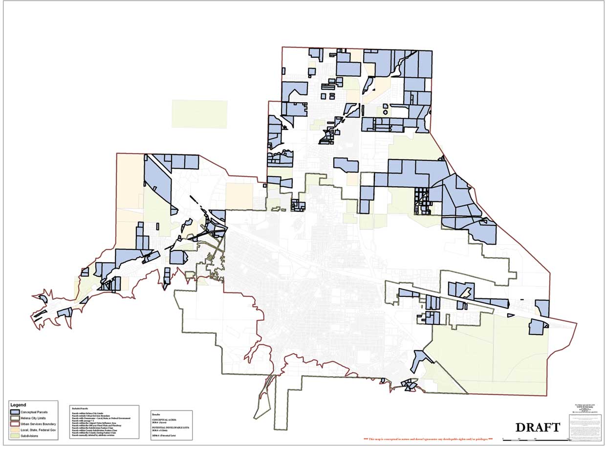 Over the course of two meetings and multiple conversations, the city/county staff outlined the steps and data necessary for the project. The meetings determined which parcels would be considered developable. A list of assumptions was created, and the exclusion of individual parcels was confirmed. Staff from Community Development, County Zoning, and GIS Services and a planner from a private engineering firm were included in these discussions. To identify suitable parcels, the Parcel feature class was the primary layer used. Selected attributes were queried for the analysis, and a map highlighting each developable parcel was generated. The first step in the project was to spatially extract all parcels that should be excluded from the project based on the urban services boundary (USB) created and provided by the Community Development Department. The USB, based on multiple considerations such as elevation for water pressure, multiple water and wastewater studies, and other various aspects, includes certain parcels within Helena Valley and excludes all parcels within the Helena city limits. The Select by Location tool in ArcMap was used to exclude specific parcels by selecting from Parcels (the original parcel feature class) all features that have a centroid in the USB feature. Next, parcels located within the Helena city limits boundary feature were removed. The remaining selected parcels were exported to create a new parcel feature class that represented parcels inside the conceptual development boundary and outside the city limits. This layer would serve as the base feature for additional analysisrelating to landownership, current use, location in a floodplain, lot size, proximity to airports, and other factorswithout affecting the original data. The techniques described in the next section were chosen by the GIS Services Department. In many cases, these data creation and analysis goals can be accomplished in a variety of ways. Local, State, and County-Owned Government ParcelsOne of the assumptions was that development would not occur on government-owned property. Consequently, all local, state, and federal government-owned parcels were excluded using the Select by Attributes tool. Parcels were queried based on the Owncode field, a coded field with values that range from 10,000 (private) to 99,999 (unknown). It is useful for cartographic symbology and querying. Selecting parcels with a code greater than 12,000 removed the federal, state, and local government-owned properties from consideration. Parcels within Subdivisions and County Zoning AreasParcels located within existing or prospective subdivisions (final, platted, proposed, or in-review subdivisions) were also removed. This determination required additional research with the County Zoning Department to confirm preliminary plats located within the project's scope. The existing and proposed subdivision layers were used. Parcels within a FloodplainEliminating parcels within certain portions of the floodplain was essential. The floodplain coordinator provided insight as to the conditions of potential development in floodplain areas. Any parcels located within the 100-year floodplain and floodway were removed using the Erase tool located in the Analysis > Overlay toolbox in ArcToolbox. This process erased any portion of the existing parcel feature that was located within the floodplain layer. Any portion of the parcel that was not included in the floodplain was retained. Some parcels did not maintain their original shape but were still included as potential developable land. Parcels within the Airport Influence Area