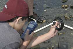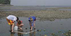 In addition, having a GIS and GPS component in the curriculum gave campers the opportunity to acquire spatial-thinking skills. President George W. Bush's High Growth Job Training Initiative has defined geospatial technologies as one of the leading job growth areas, and spatial thinking has been identified by the U.S. National Research Council as critical to success in the workplace and science. After a short introductory lecture on GIS and GPS technology, campers worked a small tutorial that taught them the essential elements of a map and how to add data and symbolize layers. Before heading out into the field, campers also tested GPS units. They could explore the units of latitude and longitude, as well as positional accuracy, and how this relates to potential problems with buildings that block the direct line of sight to the sky. Counselors gathered the coordinates students collected and displayed these locations using the GO TO X,Y tool in ArcGIS 9.2. These coordinates were displayed on a map with high-resolution photographs. Enhancing Crab Study with GISThis year's study focused on crab ecology. specifically crab population dynamics relating to water quality and substrate. Campers, organized into small groups, collected data on dominant crab species, diversity of crab species, percentage of females, and percentage of pregnant females. Along with the crab information, the campers collected information on water temperature, pH, salinity, dissolved oxygen, and substrate type. Secondary topics covered were water pollution, invasive species, and potential correlation between environmental variables and crab biology. As they explored the biological and physical diversity of this area, campers visited seven Boston Harbor Islands. When the campers arrived at the sampling site, they laid down a quadrat (a sample area, in this case, a square- meter rectangle) within the intertidal zone. Intertidal height varied at each site depending on the tidal stage, but the study mainly focused on midintertidal regions. At each site, the campers used the GPS units to determine the latitude and longitude position and recorded this information on a data sheet. Next, campers took measurements of various water quality parameters using appropriate instruments (e.g., pH meters, salinity meters). In the last step, all the crabs in the quadrat were collected and placed in a bucket to be sorted by species, then sized and sexed. Finally, it was determined which females were pregnant. At the end of each day, campers transferred data from field data sheets to a spreadsheet that replicated the data sheet but also automatically converted the degrees, minutes, and seconds obtained from the GPS units to decimal degrees for easy integration with ArcGIS.