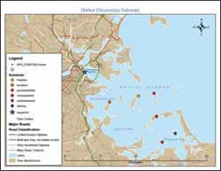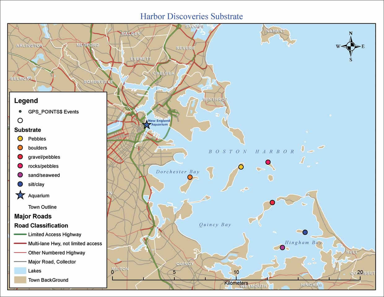 The Harbor Discoveries Summer Camp is an environmental science day camp with a marine science focus. Harbor Discoveries is the first camp program to make extensive use of the Boston Harbor Islands National Recreation Area as a living laboratory for aquatic science education and environmental stewardship. Through a combination of hands-on science and traditional camp activities, the program seeks to foster an appreciation of the importance of habitats for all life and helps prepare campers to become future advocates for the planet. The academic component of Harbor Discoveries sets this summer program apart from many others. Each week's curriculum focuses on a particular theme. Using inquiry-based methods, the camp examines the interdependence of living things and compares similarities and differences among local habitats. By emphasizing scientific process skills, the program imparts informal science learning almost without students realizing it. Through hands-on, field-based experiences, participants are exposed to a variety of environmental issues pertaining to the marine environment. GIS and GPS technologies are integrated into the camp week called Sea Lab, which is focused on budding marine scientists in the eighth and ninth grades. The Sea Lab week uses current research practices to explore marine biology, ecology, and now geography. This week was chosen because it focuses on hypothesis-driven research, which allows spatial thinking and concepts to be easily integrated with these activities. To keep the GIS and GPS component a hands-on one for all campers, class size was limited to 12 students and counselors ensured that each camper had the opportunity to interact with the GIS system and a GPS unit. During this rigorous week, campers worked side by side with New England Aquarium researchers and camp counselors. They learned about scientific inquiry by developing hypotheses, performing fieldwork, and analyzing results. Before heading out into the field, they spent time in the classroom learning about the ecological components of the study, methodology, techniques, and technology. Classroom time also included fun team-building exercises. The aquarium is just a short boat ride away from the Boston Harbor Islands National Recreation Area, which provided an excellent field laboratory for the study of marine ecology. During the week, campers explored the six islands, took samples and measurements, and recorded and mapped the results. Real-World Examples of GIS UseThe New England Aquarium has used GIS in its research analyzing the spatial patterns of North Atlantic right whales (Eubalaena glacialis) relative to fishing and shipping activities, which are two of the leading causes of mortality for this species. Because geospatial technology is an important and growing component of the New England Aquarium's research, camp program directors wanted to incorporate GIS and GPS technology into the analysis of the data collected by campers. Researchers and counselors teamed up with campers and provided examples of how the aquarium employs these technologies in its research.