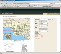 The GeoBrowser is a custom-built Esri ArcIMS map coded using Java, JavaServer Pages, and JavaServer Faces (JSF). This application was developed and tested with Tomcat 4.1.29. The JSF API is used to render HTML pages, and the Esri ArcIMS Java Connector API is used to communicate with an Esri ArcIMS image service. The application also uses JavaScript and cascading style sheets (CSS) to provide the Web site with interactive GIS functionalities. The GeoBrowser user interface provides standard navigation tool buttons (zoom in, zoom out, zoom global, fixed zoom in and out, and pan). The user draws a box on the map using the Search Box button to retrieve all the georeferenced records in the digital library database (Oracle Database Server) within the geographic boundaries of the box. The bounding coordinates of the search box (latitude and longitude of the northwest and southeast corners of the rectangle drawn on the map) can be viewed in text boxes below the map. A user may display the results of a search box search as points using the View USC Digital Archive Holdings tool. Selections often appear in clusters that may be better viewed by zooming in on the map. A user may also use the Clear Map View and Web Page tool to clear the search box and digital archive holdings from the map view and refresh the text-based search options. A Help tool is also available to view GeoBrowser tool button descriptions. Map layers can be controlled by clicking the check boxes adjacent to each layer name. This displays or hides the layers in the map view. The list of layers shown beneath the map are point, line, and polygon shapefiles. GeocoderThe geocoder feature was initially built to test the feasibility and scalability of new address matching procedures and algorithms developed by Rahul Bakshi and others at USC. The algorithm's main innovation is the ability to consult multiple sources to discover the actual number of addresses, their layout, and their actual geometry (i.e., features) occurring on a street, rather than using the address range associated with the segment for linear interpolation as traditional geocoders do. This additional knowledge allows for interpolation of locations along street segments with improved accuracy. These algorithms have been implemented into a scalable and reliable geocoding Web service, which is integrated into the GeoBrowser application. The geocoder can be used to search the USC Digital Library for selections without requiring that the user know the spatial coordinates of an area of interest. A simple search based on address may be easier for a user who is unfamiliar with the geography of a region and cannot readily locate and draw a region of interest on a map. For the geocoder application to work efficiently, the user must enter both the street address and ZIP Code. An address and ZIP Code search can be defined by entering any address in the United States to search for selections within a given radius of the address. The radius has been predefined in the application by the Digital Library staff. The ZIP Code may narrow the geocoding search to a smaller area than a search on a street name. The search has the greatest chance of success if the user can also provide the ZIP Code in those instances in which there are many street segments with the same name. The search is executed by clicking the red Search button beneath the text-based Advanced Search options. All entries and selections in the text-based search tools can be cleared by clicking the red Reset button. GazetteerThe gazetteer database and service are restricted to the city of El Segundo in Los Angeles County. The gazetteer was built to demonstrate how newly developed Web harvesting tools could be deployed to build gazetteer databases quickly and cheaply. The gazetteer provides a highly detailed location filter that the user employs to identify a specific location, such as a business, and retrieve all of the Digital Library selections within a specified geographic buffer around the chosen location. The buffer radius is currently predefined in the application by the Digital Library staff. Continued on page 2 |