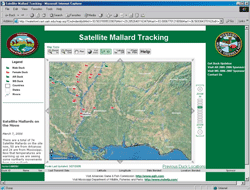 The satellite transmitters currently used are 30-gram PTTs. The units are fitted around each bird like a backpack using straps made of Teflon ribbon, the same material used in bulletproof vests. This attachment method has been effective while having a low impact on the birds. Once the transmitter is attached, the bird is released. After initialization, the transmitter operates according to a schedule. That schedule varies depending on the time of year and helps conserve the battery for use during the migration. During the spring migrations north, transmitters are active for 6 hours every 3 days. When birds are on the breeding/nesting grounds in the summer, transmitters are active for 6 hours every 10 days. While the birds are migrating south during the fall and winter months, the transmitters are active for 6 hours every 48 hours. The transmitters establish their location using National Oceanic and Atmospheric Administration satellites. The data collected is transmitted via a third-party data service to a database that stores location data as well as information about the quality of location data, activity sensor data, battery information, and temperature. Analyzing activity sensor data can determine if a PTT is still active. PTT inactivity can mean the bird has died or the bird is no longer wearing the unit. Designing the ArcIMS SiteAfter AGFC decided to create an ArcIMS site for tracking the mallards, the Center for Advanced Spatial Technologies (CAST) was contracted to design and develop an automated ArcIMS site that would require little manual interaction. CAST and AGFC worked together on the Web site portion of the ArcIMS site. Continued on page 2 |