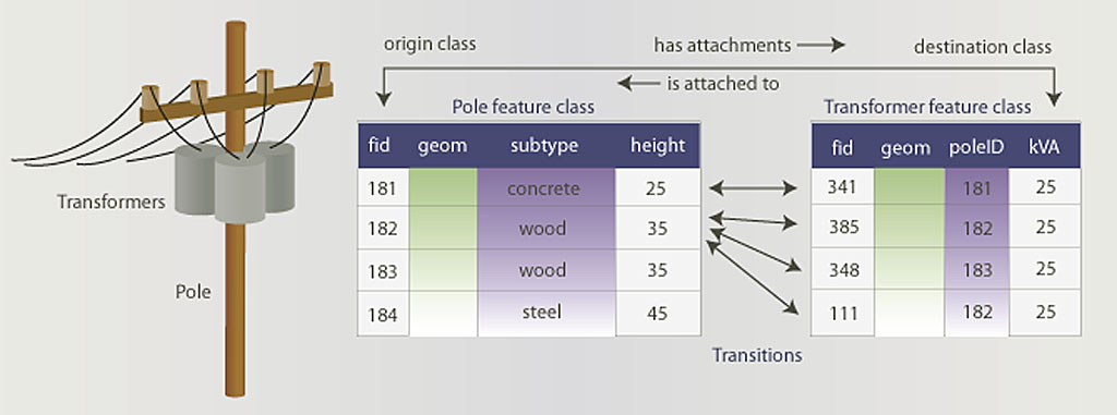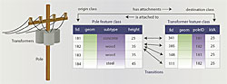 | The geodatabase can implement business logic by capturing the spatial relationships between features and performing data validation. In this example, the one-to-many association between utility poles and electric transformers is modeled. |