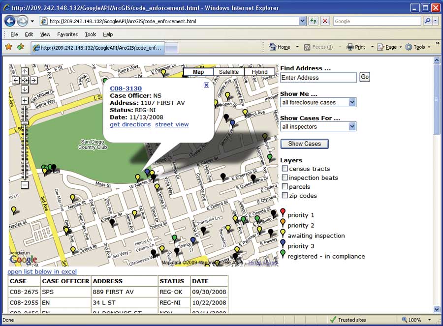 | Chula Vista's GIS team built a Web site based on ArcGIS Server using ArcGIS JavaScript Extension to the Google API and the ArcGIS API for JavaScript. Each property is mapped with a Google "balloon" and color coded based on the inspection status. |