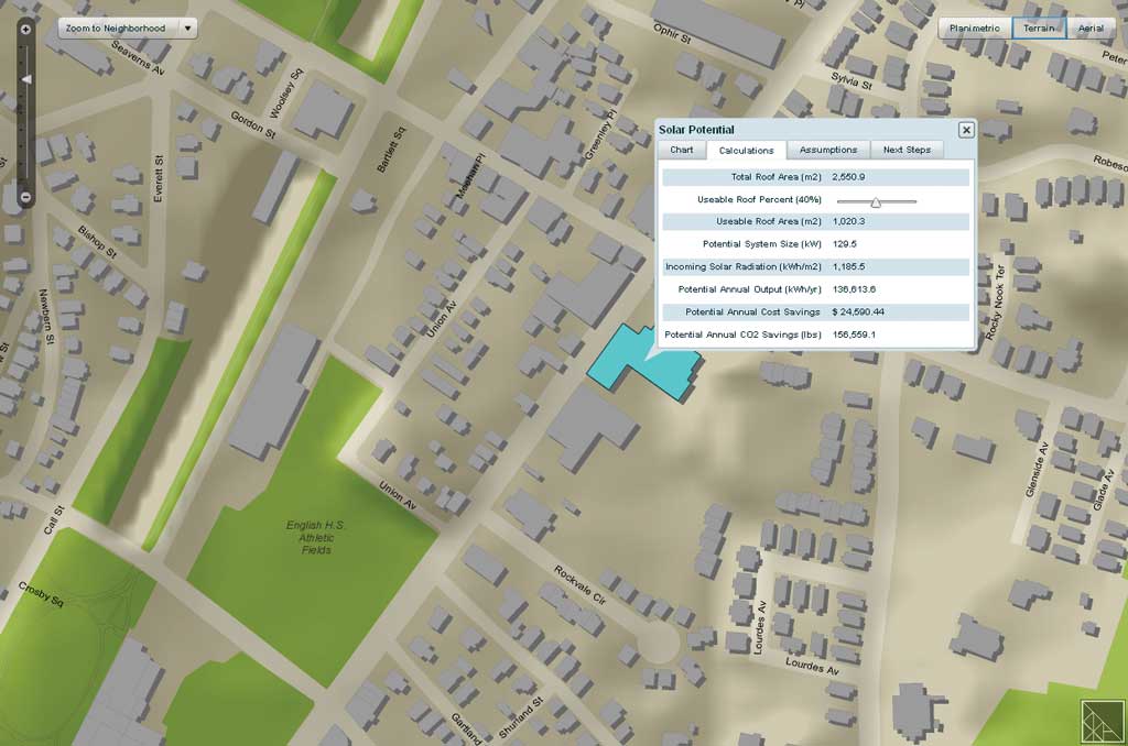 GIS is contributing significantly to the development of commercially viable renewable energy. Utilization of the two most common renewable energy sources, solar and wind, is more challenging than conventional energy sources. Both energy sources are available intermittently and are typically more geographically dispersed than oil or natural gas. GIS helps evaluate the potential of sites for energy generation and the feasibility of getting energy to users. The Boston Redevelopment Authority created Solar Boston, an online mapping application developed using the ArcGIS API for Flex, that allows users to see active renewable energy installations within the city and calculate the solar potential of building rooftops. In addition to calculating usable roof area and incoming solar radiation, this application generates figures for annual energy output in kilowatts per year, anticipated annual cost savings, and CO2 savings. The site for the wind farm project and the location of individual wind turbines within Iberdrola Renewables' Rugby Wind Project were determined using GIS to assess wind availability, take into account the existing electrical transmission infrastructure, and consider many environmental factors in the surrounding area. The project, currently under construction near Rugby, North Dakota, could produce enough power for 11,000 homes. The Grid Can't Be Smart without GISThe role of GIS in transforming utilities that use conventional energy sources is substantial. Utilities already use GIS to comprehensively inventory electrical distribution network components. In the future, existing GIS implementations will be the foundation for Smart Grid. Rather than a specific system, Smart Grid is an approach for intelligently managing the generation and delivery of energy. Not only does it help utilities handle loads more efficiently, it also enables interaction between the providers and consumers of electricity and significantly automates the process of restoring the network after an outage.