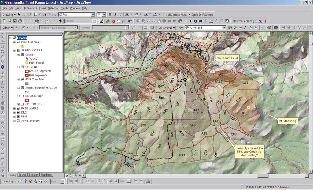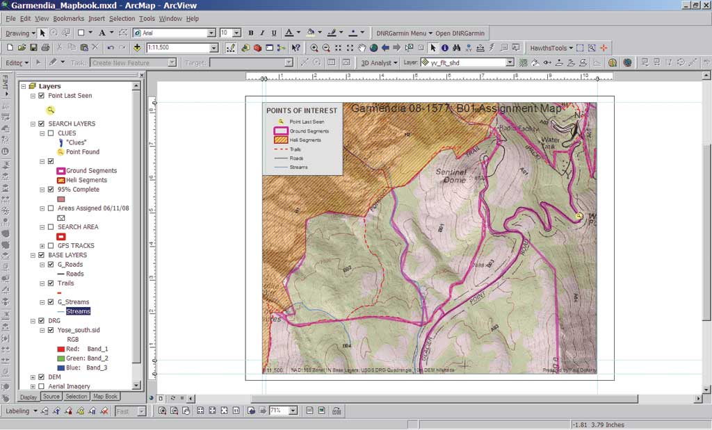 A myriad of data is built and maintained by the National Park Service and the YOSAR GIS team. This includes vector data for roads, streams, trails, park buildings, vegetation, and helispot locations. Raster data includes digital elevation models (DEMs), which supply a three-dimensional surface with topographic features; digital raster graphics (DRGs), which are high-quality scanned images of U.S. Geological Survey quad maps that provide contour lines and detailed terrain information; and 2005 National Agriculture Imagery Program (NAIP) aerial imagery. During a search incident, Doherty works with YOSAR search incident data to generate additional data such as search area polygons; search segments/assignments; clues (i.e., point last seen, footprints, litter, and trail interviews); viewshed analyses; and GPS tracks from helicopters, ground crews, and dog teams. GIS Gets the Job DoneWith each new search operation carried out by YOSAR since the adoption of GIS in 2008, GIS has become more of a key component.