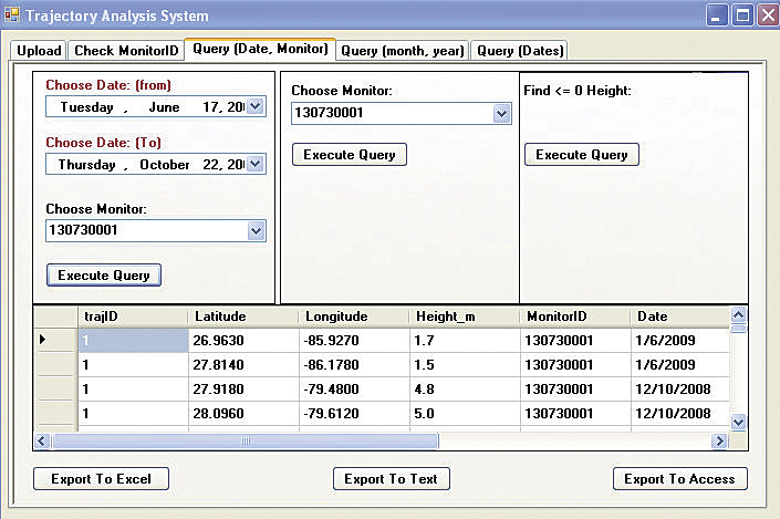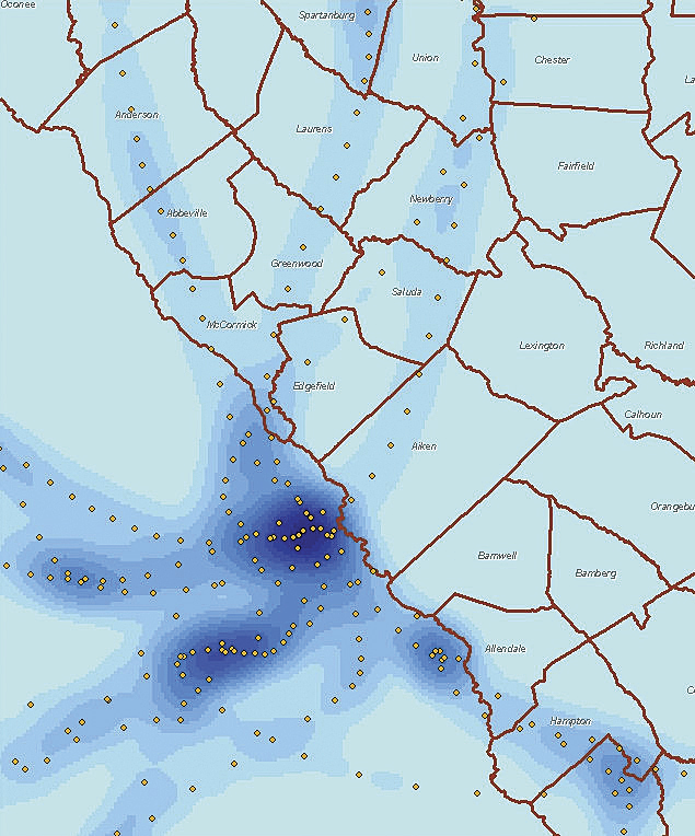 AERMOD is a steady-state plume model that is used to predict pollutant concentrations at selected downwind receptor locations. The model was developed by the American Meteorological Society (AMS) and EPA. Facilities applying for an air permit in South Carolina must demonstrate compliance with applicable air quality standards. AERMOD is the current EPA-recommended refined model to be used for this purpose. AERMOD contains two input data preprocessors that are part of the regulatory modeling system: AERMET and AERMAP. AERMET processes meteorological (surface and upper-air) characteristics data. Its output is input directly into AERMOD. AERMAP processes digital terrain data and requires as input either National Elevation Dataset (NED) or digital elevation model (DEM) data. The terrain data is used primarily to establish the elevations of the model receptors and the topography in the modeling domain. To make the modeling process more efficient, BAQ developed an application that allows users to download AERMET and NED data from the BAQ Web site through an interactive map. Data can be obtained for each county. The mapping application was created using the ArcGIS API for Flex. Flex was chosen because it gives the user rich interactivity and has a robust development environment. The application can be viewed at infoweb01.dhec.sc.gov/aermod/app/aermod.html. Trajectory AnalysisA trajectory is a three-dimensional view of the path an air parcel travels based on meteorological data. To understand air movement, trajectories are created and analyzed for every 8-hour ozone exceedance day. Trajectories are created using the Hybrid Single Particle Lagrangian Integrated Trajectory (HYSPLIT) model from the National Oceanic and Atmospheric Administration (NOAA). Detailed information regarding the trajectory model can be found on the NOAA Web site at www.arl.noaa.gov/ready/hysplit4.html. Output files from the model contain the longitude and latitude for a parcel of air. Frequently, back trajectories are analyzed because they provide clues about the origin of air masses and assist in determining possible meteorological conditions during elevated ozone episodes. Each trajectory runs back in time for a 36-hour time period. The Trajectory Analysis System and ArcGIS tools were created by BAQ to aid the analysis process. Trajectory Analysis System is a simple .NET application that is used to load the trajectory output files from the model to a Microsoft SQL Server database. The data can be queried by locations, date range, height, and hour and displayed in ArcGIS to be analyzed further. Back trajectories were queried for days when the maximum 8-hour ozone concentration exceeded 0.075 ppm at the Jackson (Aiken County) ozone monitoring station through the years 2006�2008. The 300-meter and 500-meter back trajectories showed transport just south of the Atlanta area, eastward into the central Savannah River area of South Carolina. Exceedances of the 8-hour ozone standard occurred across the Atlanta area on May 2 and May 3, 2007. Ozone precursors from the Atlanta area moved into the central Savannah River area on May 3, 2007, and this, combined with meteorologic conditions, resulted in an ozone exceedance at the Jackson site. Ambient Air Monitoring Network Assessment