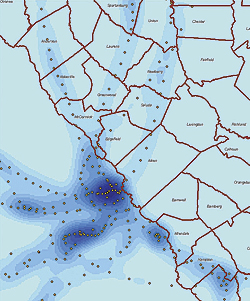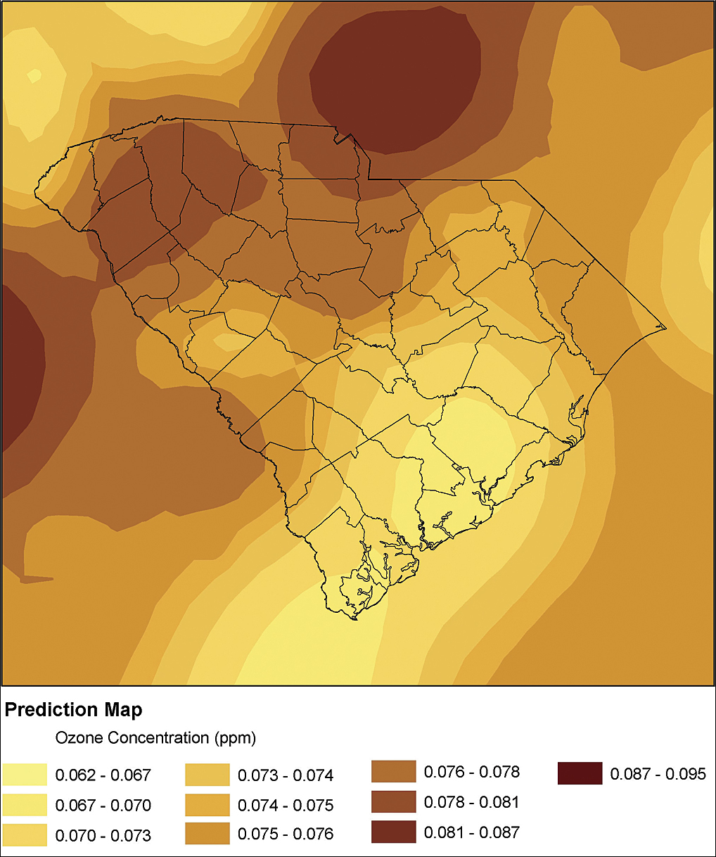 The Clean Air Act forms the framework for all efforts leading to the protection of air quality. The mission of the Bureau of Air Quality (BAQ) at the South Carolina Department of Health and Environmental Control (SCDHEC) is to "conserve and enhance air resources and ensure that ambient air quality is maintained at the highest level." Projects/Applications at BAQBAQ protects air quality through regulating emission sources, planning, education, and the implementation of various air quality programs. GIS has become an important tool to assist in environmental decision making at BAQ. South Carolina Ozone Nonattainment BoundaryGround-level ozone is an air pollutant formed by chemical reactions between oxides of nitrogen (NOx) and volatile organic compounds (VOC) in the presence of sunlight. The ozone season in South Carolina begins on April 1 and lasts through October 31 of each year. BAQ has developed an extensive ambient air quality monitoring network for ozone and other pollutants. In operation since 1959, the ambient monitoring network is used to establish general or background information in rural areas, determine the effects of NOx and/or VOC emissions from specific sources on ozone formation, monitor pollutant concentrations in suburban and urban areas, and ascertain interstate and intrastate transport of pollutants. In 2008, there were 16 ozone monitors strategically located throughout the state that had at least three years of quality assured data. These monitors were located in accordance with United States Environmental Protection Agency (EPA) monitor siting guidance. Ozone concentrations are measured 24 hours per day, and 8-hour moving averages are calculated. The maximum 8-hour average is reported each day.
