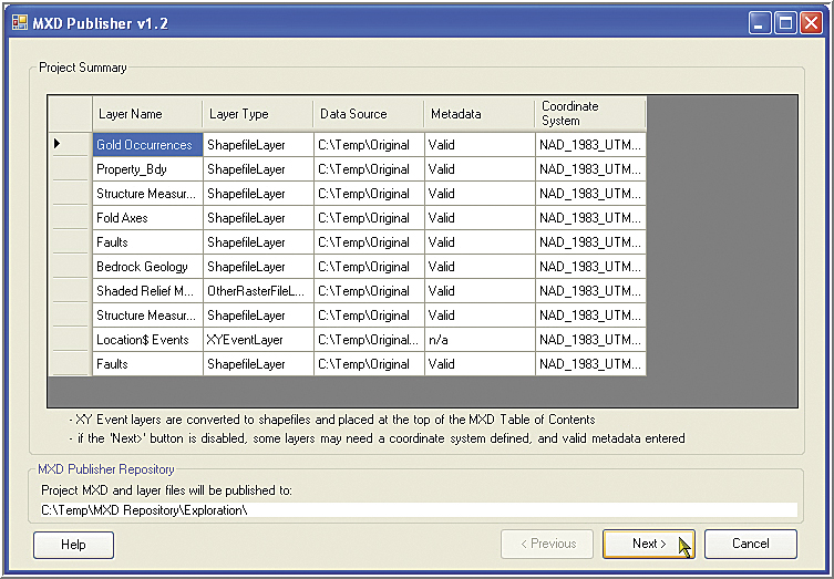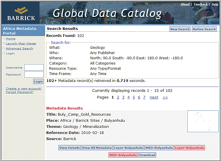 This article as a PDF . As the largest gold mining company in the world, much of Barrick's stock market value depends on its reserve base (i.e., gold proven to be minable but not yet mined). With annual gold production of nearly 8 million ounces, Barrick must add at least that much gold to its reserve base each year or its stock market value will decline. Consequently, Barrick's geological data directly affects the company's bottom line. Impressive Shelf LifeGeologic data has an unusually long life cycle. Because ore-forming processes act over millions or tens of millions of years, data collected decades ago is still relevant to any mining company. Barrick has more than a quarter century of self-collected and purchased data as well as more than 100 years' worth of data inherited from acquired companies. Effectively managing this rapidly growing collection of geology, geochemistry, geophysics, and remotely sensed data is crucial. To make best use of its impressive data archives, Barrick recently began an initiative to better organize and serve its data throughout the company, and a spatial data infrastructure (SDI) was born. Within a mining company, different departments often have data that other groups can use. At Barrick, when surveyors collect as-built data for a mine site, that data can be of interest to the Mine Geology, Security, Health and Safety, and Exploration groups. An SDI simplifies the way spatial data is disseminated and accessed throughout an organization. "Although our vast store of exploration data was the catalyst for the initiative, the project grew to include Environment, Land, Security, and Health and Safety [groups]," said Iain Allen, global spatial data systems coordinator for Barrick. "Making every group's data available to everyone else eliminates the likelihood of duplicate data collection and/or purchasing." The Migraine of Fine GrainThe crucial first step in creating an easily searched data catalog is generating metadata for each dataset. However, as anyone who has created metadata knows, the devil is in the details. "Everything depends on metadata, but no one likes to do metadata," laughed Allen. "We use a custom metadata editor, MetaTools 5, by Peter Barrs of Data Arterial in Stanthorpe, Australia, which runs in ArcMap as well as ArcCatalog." Barrick standardized on 14 mandatory metadata elements and four optional ones. "We do not have dedicated data managers, so we depend on the end user for metadata. If it's too tedious, they won't do it. We tried to find a balance between everything we would like to know about a dataset and what we could realistically expect people to do."