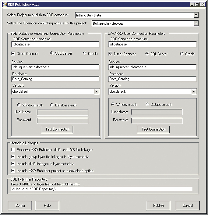 The Barrick metadata editor uses pick lists for every metadata attribute. The pick lists automatically sync with a server-based Master Keyword Database every time the editor opens, ensuring everyone always has the most current set of keywords. Adding new keywords is done through a Web form, which adds them to the master database. The editor also facilitates the copying of metadata. Working in ArcMap, where the datasets typically have many common metadata attributes, can greatly speed metadata creation. The user completes all the common metadata elements for one dataset, copies them to all the other datasets, then completes the one or two remaining variable elements individually. Publish or PerishDetailed metadata is worthless if the data can't be queried and accessed. To publish the data, Barrick uses MXD Publisher, created to Barrick specifications by NGIS in Australia. MXD Publisher, which will not allow data to be published if it does not have complete metadata, creates a file geodatabase at a specified location on the network, also capturing all the layer files and creating a copy of the MXD that references the newly created file geodatabase. "This is our way of overcoming 'C-drive syndrome.' We find that a lot of data exists only on a particular user's laptop, so no one else even knows it exists," said Allen. "Through the MXD Publisher, all the datasets used in the published MXD are copied to the network drive. Data previously available only on their laptop is now also available, with complete metadata, on the network." The final step in the Barrick workflow is SDE Publisher, another custom NGIS tool, that publishes the file geodatabase on the network to the enterprise geodatabase in ArcGIS Server. Each night a metadata harvester runs and updates the data catalog with the metadata for any new datasets (the data catalog uses the Esri GIS Portal Toolkit [now known as the ArcGIS Server Geoportal extension] for presentation and ArcGIS Server with SQL Server for storage). Dennis Geasan from GIS Technologies in Anchorage, Alaska, was instrumental in setting up the back-end processes. Search results include links to the individual datasets and to the source MXD. The results are presented with selected metadata, and buttons allow users to either stream the dataset or complete MXD directly from the server to their desktop client or download the data directly. FME Server is used for the ETL (extract, transform, and load) function, giving Barrick the ability to deliver search results in any format desired. This is important because Barrick supports two desktop GIS packages.