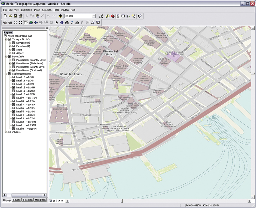 The World Topographic Map contains city-level detail supplied by local governments such as New York City data from 1:9,000 to 1:1,000 scale contributed by the New York City Data Mine and several New York city agencies, including the Department of City Planning, Department of Information Technology, Department of Parks, Landmarks Preservation Commission, and New York City Economic Development Corporation, and data from the University of Virginia Library.