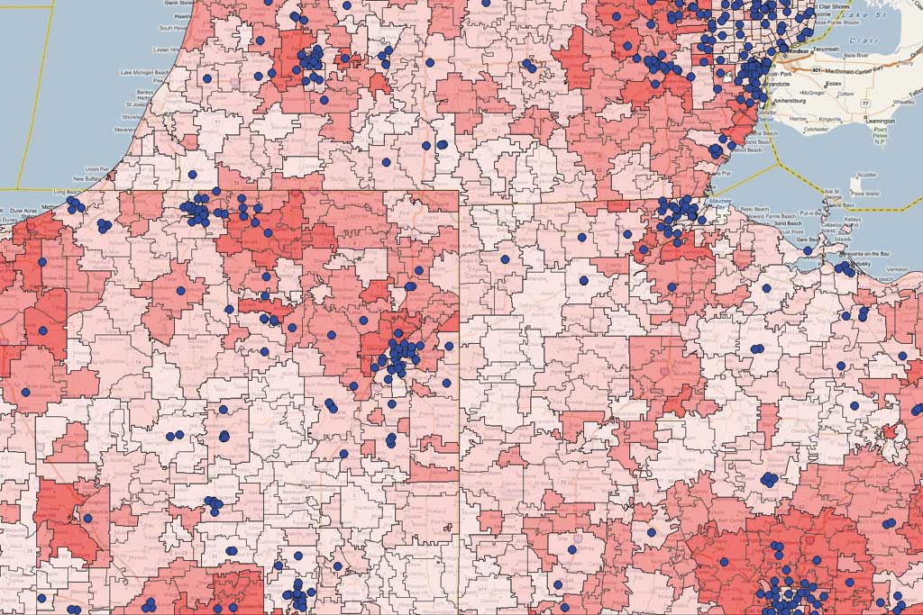 Maps can also be created after generating a report. Subscribers simply create a Branch Analytics report that, for example, looks at company market share in an area. The application automatically exports the analysis to a map. As information is updated, or the analysis is customized, the map dynamically absorbs the changes to reflect the adjusted report.