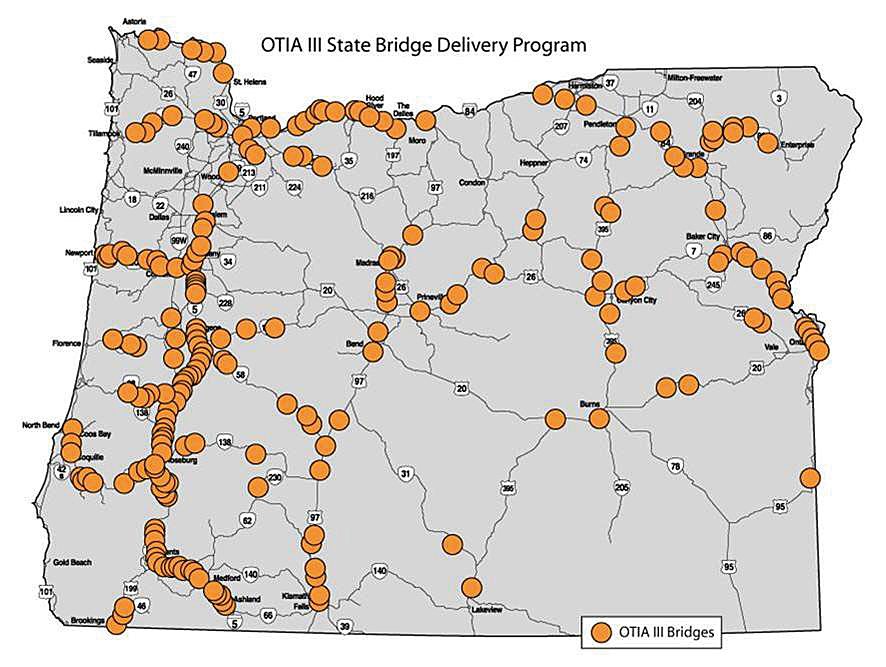 The OTIA III State Bridge Delivery Program is a 10-year, $1.3 billion program that will repair or replace hundreds of aging bridges on Oregon's highway system.