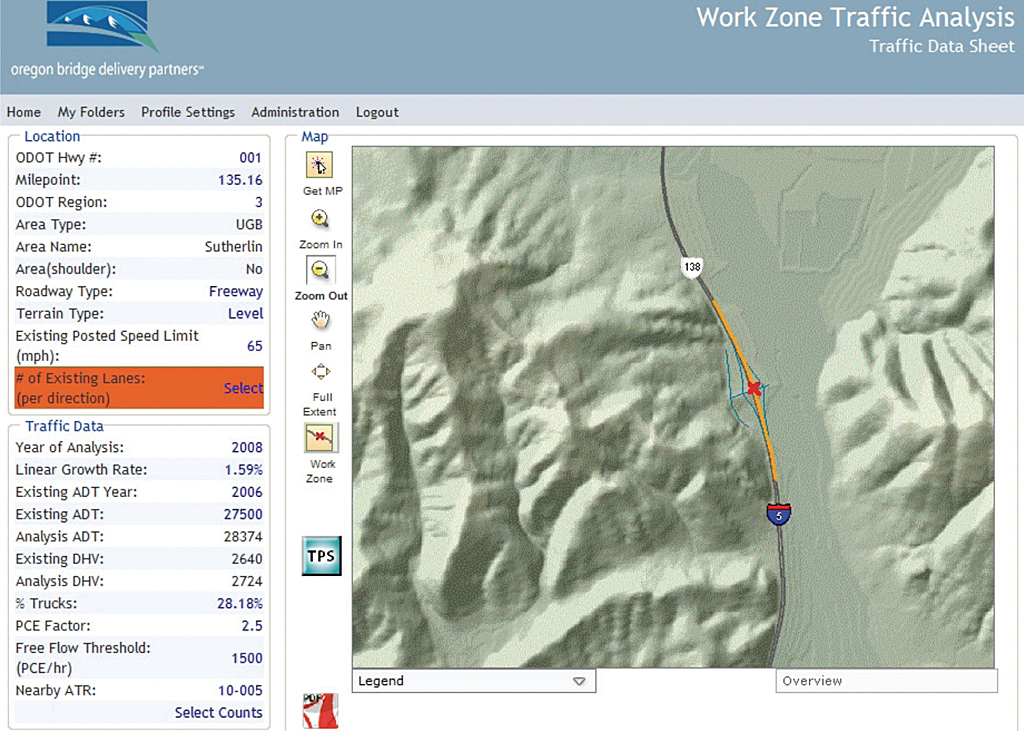Although much leaner, the spreadsheet-only approach experienced crashes as the database grew ever larger. The traffic team worked with OBDP to develop a more efficient GIS-based method for running traffic scenarios—one that tightly wove ODOT's geospatial data into a dedicated web-based analysis tool. Using common protocols, they worked on tying the datasets together to give ODOT staff direct access to the department's databases from a single interface. Called the Work Zone Traffic Analysis (WZTA) tool, the application allowed traffic scenarios to be run and shared in a web browser.