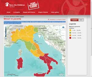 This map, created by Save the Children, shows the number of children in relative poverty in Italy. This international organization has created more than 70 maps that profile children and adolescents in terms of demography, environment, social spending, poverty levels, and other factors that indicate well-being.