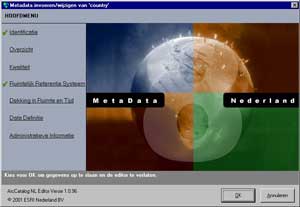 Editor's note: This article describes how a Dutch version of the European metadata standard CEN/TC287 was implemented by customizing ArcCatalog in ArcInfo 8. With ArcGIS 8.1, in addition to the Federal Geographic Data Committee (FGDC) standard, other metadata schemas are supported. Users can develop custom metadata synchronizers that read dataset properties and store those properties automatically in a metadata document according to another specified standard. ArcCatalog has an open extensible architecture and provides a framework for the implementation of a custom metadata environment. Metadata describes and documents spatial data. Metadata assists data managers in archiving data and data users in searching for data. Spatial metadata is one of the key components of a geoinformation infrastructure. Data managers prefer to keep the metadata with the data, while data users are primarily interested in a metadata environment that can be queried. Publishing metadata in a clearinghouse provides a searchable database of information about geodata and promotes data sharing. With ArcCatalog, Esri introduced a system that automatically associates metadata with spatial datasets. The use of content standards that determine what metadata is collected is an important issue. Out of the box, ArcCatalog currently supports the FGDC content standard used by the United States for spatial metadata. However, in Europe, the CEN/TC287 standard, sponsored by the European Committee for Standardization, has been widely adopted. Esri Nederland B.V. integrated ArcCatalog with the relatively well-developed metadata standard used in the Netherlands. Central to this effort was the design and implementation of metadata schema and an editor that supports the Dutch content standard for spatial metadata, a locally redefined subset of the European CEN/TC287 content standard. Why Metadata?Because spatial data is the fuel of a GIS, it is important to know if the data will meet the system's needs. Metadata describes data using terminology that defines potentially disparate data and facilitates consistent collection, indexing, querying, and publishing. Metadata documents content, quality, source organizations, data format and organization, collection schedule, uses, data currency, spatial references, and distribution mechanisms for the data. Keeping spatial metadata records is important. From a data management perspective, metadata is important for maintaining an organization's investment in spatial data. Data users need metadata to locate appropriate datasets. Metadata provides information about the data available within an organization or from catalog services, clearinghouses, or other external sources. Metadata not only helps find data, but once data has been found, it also tells how to interpret and use data. Publishing metadata facilitates data sharing. Sharing data between organizations stimulates cooperation and a coordinated, integrated approach to spatially related policy issues.