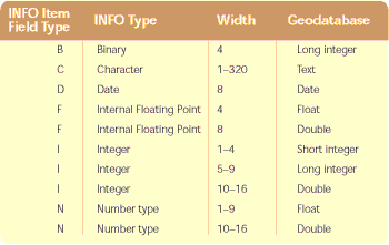 Coverages and WorkspacesTypically ArcInfo coverages are stored in workspaces that implement the georelational model by storing topology and linking attributes to features. An ArcInfo workspace is a special type of folder that stores attributes for data in INFO tables. All tables are managed through an INFO subfolder. Most types of coverage features are explicitly associated with other features in the coverage. For example, the topological association between a node feature and an arc feature is defined by the ARC#, FNODE#, and TNODE# items. Use the topology tools while editing coverages in ArcMap. For example, reshaping the boundary of a polygon with the Shared Edit tool will automatically update the shape of the arc and maintain the association between features. Similarly, use ArcCatalog to create, move, and delete items in an ArcInfo workspace to maintain data integrity. Never use Windows Explorer or My Computer to manage coverages, grids, or TINs because either application will break the synchronicity between coverages and the INFO subfolder, and the data will be corrupted. Feature classes in coverages are homogeneous collections of features. Primary coverages contain points (label points), lines (arcs), polygons, and nodes that have topological associations. For example, arcs form the perimeter of polygons, and nodes form the endpoints of arcs. Secondary coverage features consist of tics, links, sections, and annotation. Coverages also contain composite features such as routes (collections of arcs associated with a measurement system) and regions (collections of polygons that can be adjacent, disjoint, or overlapping). The GeodatabaseBasically, a geodatabase is a storage mechanism for spatial and attribute data that contains specific storage structures for features, collections of features, attributes, relationships between attributes, and relationships between features. All geodatabases, whether personal or ArcSDE, can store tables, feature classes, feature datasets, and functionality such as rules, relationships, and geometric networks. Feature classes in geodatabases are collections of features with the same type of geometry. Each feature class uses the same attribute columns to describe the features, and all features share a common spatial reference and common behaviors. Features belonging to the same feature class render in the same way, respond in the same way to queries, and have the same attribute validation rules. If several feature classes share some spatial coincidence and a common spatial reference, they can be inserted into a feature dataset. Although feature datasets are an attractive organizational structure, there is a cost associated with using them. Updates to a feature class in a feature dataset can potentially ripple to other feature classes within the feature dataset that participate in topological relationships. If feature classes have no topological association with the other feature classes, don't include them in the same feature dataset. Use feature datasets to group classes that have topological relationships with each other (e.g., geometric networks and planar topology). Don't overload feature datasets with unnecessary feature classes--stand-alone feature classes at the database level are perfectly acceptable. Item Types vs. Field Types