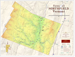 This map of a Vermont town was produced using ArcView GIS 3.2 and ArcView Spatial Analyst and XTools extensions available from the ArcScripts pages of the Esri Web site. Although data import, projection, and overlay tasks were performed using the ArcToolbox application in ArcInfo 8.0.2, those tasks could have been carried out using ArcView GIS. The large datasets used for this map seriously challenged the author's hardware--a Dell Precision 410 with dual 400 MHz processors, 512 MB of RAM, and a 32 MB Diamond Fire GL1 AGP video card. This computer was running Windows NT 4.0 with Service Pack 6a. Printing was done on an Epson Stylus 3000 at 720 dpi using Epson drivers and ArcPress for ArcInfo. The Town of Northfield, VermontVermont towns are rather small. Using shaded relief exclusively within the town's borders would omit key terrain features that might help in visualizing the town's relationship to its surroundings. On the other hand, since the focus of this map is the town, the use of colorful shaded relief across the entire map area would distract the viewer from the map's subject. Ideally, subdued shaded relief in the areas outside the town would show the surrounding terrain and more colorful shaded relief within the city limits to focus attention on the town. Dual Elevation EncodingThe strategic use of subdued and colorful relief mapping was achieved by using different color schemes within the same grid. The grid's elevations were modified so that separate elevation color sets could be applied to two areas of the map. This was accomplished by manipulating the elevation values selectively so that the focus area and surrounding area no longer shared common elevations.