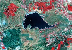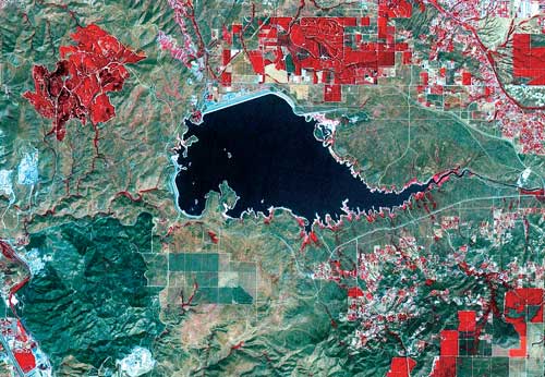 The Center for Natural Lands Management at the Lake Mathews Reserve in Southern California uses panchromatic five-meter Indian Remote Sensing (IRS) satellite imagery combined with infrared and color bands from the Landsat multispectral satellite. The false color imagery and change detection techniques facilitate tracking of patterns of vegetation growth and evaluation of management strategies for controlling exotic nonnative grasses versus native sage scrub. Lake Mathews is owned by the Metropolitan Water District of Southern California.