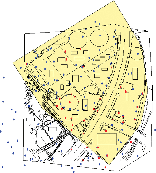 A case study illustrates the applicability of ArcGIS, with the ArcGIS Spatial Analyst extension, to determine the spatial distribution of potential hydrocarbon migration of NAPL at a former petroleum refinery and processing facility where known releases had produced five distinct oil plumes. Site characterization activities at the facility involved the installation of more than 50 soil borings and 35 groundwater wells as shown in Figure 2. Data from these locations indicated that several NAPLs were present at the site, and the plumes varied in composition from fuel oil to diesel fuel. Measured oil thicknesses ranged from less than 0.25 feet to more than 8 feet. In addition, the soils across the site varied from clay to medium sand. To further complicate the situation, the water table at the site varied daily due to tidal fluctuations in an adjacent inlet.