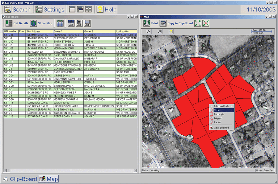Oracle's Web tools using 8i and Esri's MapObjects for map and photo display using multiple keys. The Recorder of Deeds system data resides in an Oracle database. Similar integration has been developed with the Assessment Office's system using Oracle and SQL*Forms. GIS provides the framework for integrating the commercial off-the-shelf (COTS) software for both the Recorder of Deeds and Assessment department. GIS is responsible for all key cross references.