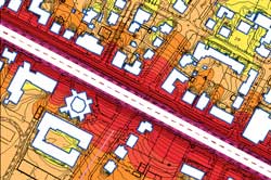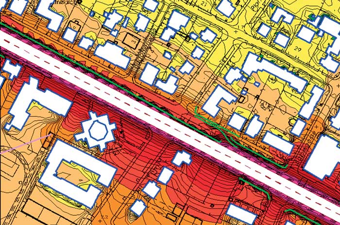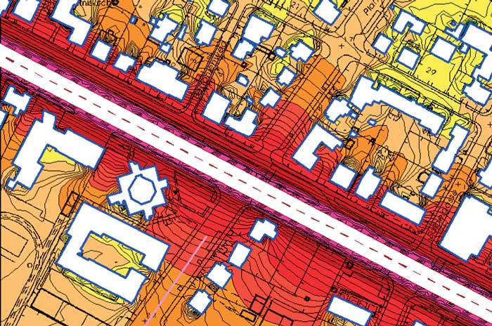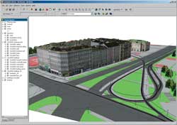 The aboveground three-dimensional city model is used primarily by noise protection officials and city planners. The entire city model is required for simulating noise propagation over a wide area. The city's noise protection departments are responsible for documenting existing noise pollution in noise maps and simulating the effect of building restrictions and protection measures. Topography and buildings affect noise propagation. A three-dimensional model of the city is therefore essential for calculating noise pollution in a city. For a typical noise protection department project, using the city model represents a time savings of more than 90 percent as compared with the time needed for preparing the geometric input needed when calculating noise using an expert system.