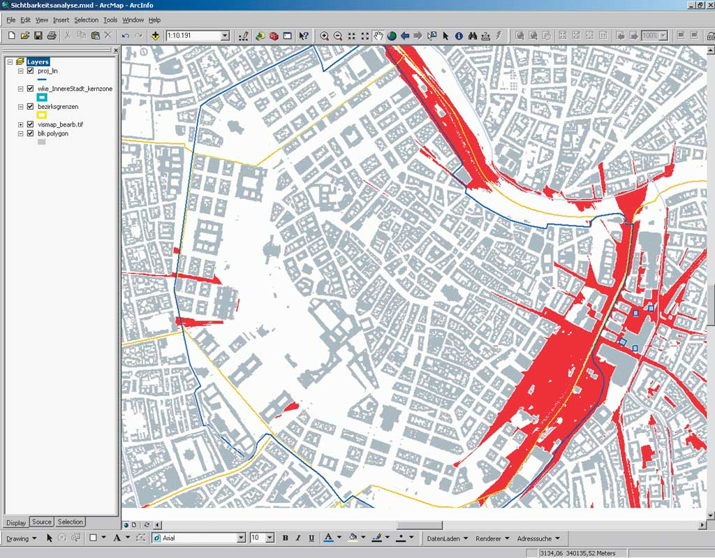 At the same time, the city's 500,000 buildings represented by simplified flat roof models and 25,000 buildings represented by detailed roof shape models were available. On demand, the roof shape models in a scene can be textured quickly using photographs that were taken on the ground. In 2005, an ArcGIS interface was developed. Using this interface, various items can be derived including