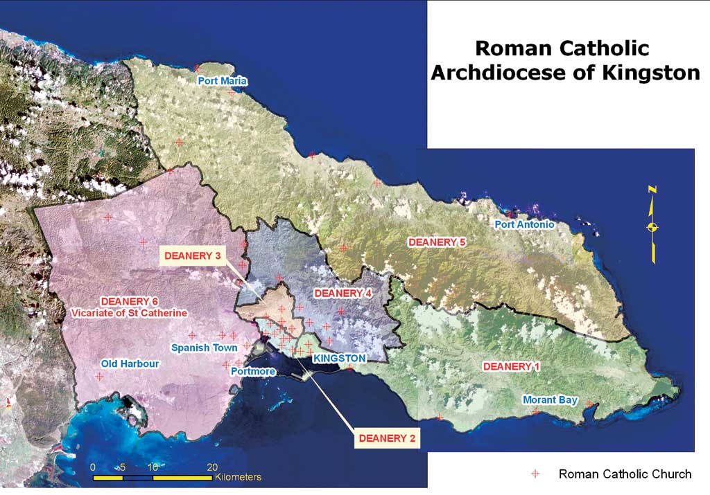 | This map shows the Kingston parishes within the archdiocese. | Jamaica and has a total population of 1.4 million. This region consists of 46 churches and missions in 32 church parishes. An estimated 56,000 Catholics live within the archdiocese, significantly fewer than the roughly 140,000 Catholics that lived there during the early 1970s.