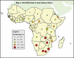 | Map 2: HIV/AIDS infection rate in Sub-Saharan Africa |