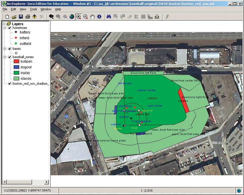 For example, the catchment area for the Milwaukee Brewers is smaller, sandwiched between the Minnesota Twins and the two Chicago teams, the White Sox and the Cubs. Students can draw what they consider the "boundary" between the two teams, noting those cities where one station broadcasts the Royals games, and another station broadcasts the Cardinals games. Some boundaries, such as the one dividing these catchment areas, are fuzzy, even in Missouri. The students can plot the location of surrounding teams, noting where those teams carve into the Royals' and Cardinals' territory. Cardinals' stations abruptly end in northeastern Illinois where the domain of the White Sox and Cubs begins. The Royals' western sphere of influence extended far into western Colorado until 1993, when Denver was granted the Colorado Rockies franchise. Colorado radio stations then switched affiliation from the Royals to the Rockies, but the absence of a team in the western north central part of the country means that some South Dakota and Wyoming radio stations are part of the Royals' network. Students can also investigate the relationship between the size of a city and the presence of a baseball affiliate radio station and compare the diffusion of baseball fans as opposed to the diffusion of radio stations in the network. A GIS-based lesson about the World Series of baseball uses maps of Fenway Park in Boston, Massachusetts, and Coors Field in Denver, Colorado. The 2007 World Series was played in these two stadiums. In this lesson, students explore the different zones in a baseball stadium from the infield to the outfield to the stands, study the direction the players face in both stadiums, and consider the effect of the setting sun on batters and players in the infield and outfield. They measure distances on each field and speculate which stadium as well as which side of the field (left, center, right) would be easiest to hit a home run.