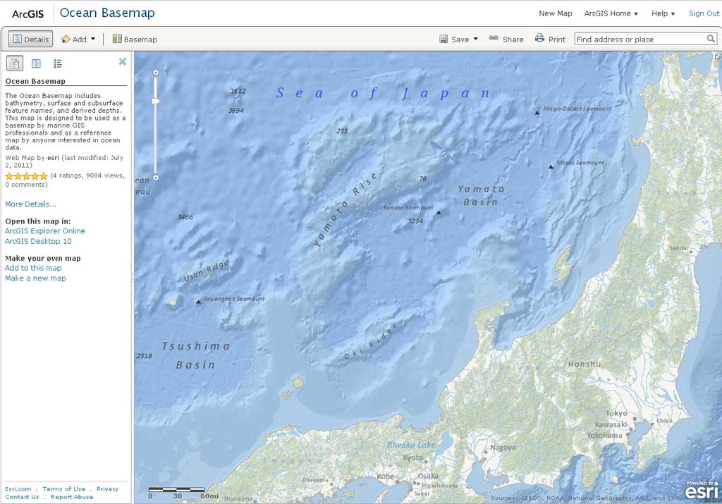 "Anyone can begin using the Ocean Basemap by simply going to arcgis.com and choosing it from the Basemap Gallery for display in the ArcGIS Online map viewer.