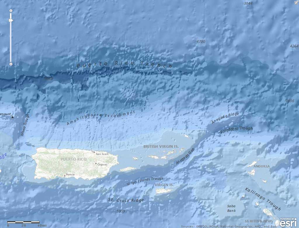 The Ocean Basemap contains more information about the ocean than any existing terrestrial basemap service, including bathymetric data, marine water body names, undersea feature names, and derived depth values in meters.