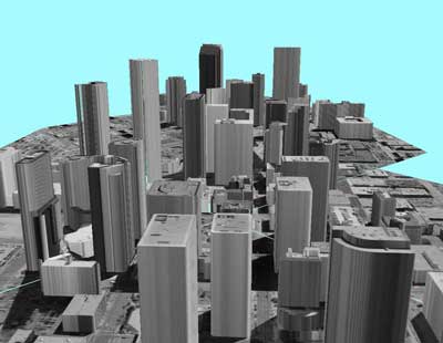 A digital orthophoto is simply a photographic map that can be used to measure true distances. It is an accurate representation of the earth's surface. To create a digital orthophoto, several key input files are necessary: aerial photos with a high-percentage overlap, scanned imagery, aerotriangulation (A.T.) results, and a digital elevation model (DEM). Scanned imagery can be obtained from scanning aerial photo diapositives or negatives on an image-quality scanner. The A.T. results include a camera calibration report and the ground control. At a minimum, the DEM can be a regularly spaced grid of masspoints, each containing an x, y, and z value. A more robust digital terrain model (DTM) can also be used because it includes strategically placed masspoints, dense breaklines, and ridgelines. Limitations of Ordinary Digital Orthophotos Expansion features, such as bridges, create problems in ordinary digital orthophotos. DTM data is captured at ground level, so bridges that are rectified with this data are "pulled down to the ground," giving them a distorted appearance. Elevated features (e.g., buildings, trees, power lines) also create a problem due to radial displacement. Distortion increases with the distance from the center of the aerial photograph-features, such as buildings, lean noticeably. The amount a feature leans depends on the percentage of overlap in the aerial photography and the height of that feature. The higher percentage of overlap in the aerial photography used, the less features will lean because the amount of photography used from the outer edge is reduced. This distortion can have an impact on the functional and aesthetic features of a digital orthophoto. True Ortho Imagery The True Ortho method, developed by Sanborn Colorado, L.L.C., produces imagery that is rectified without building lean. Surrounding streets and other cultural features, ordinarily not visible in standard orthophotos, are clearly shown. This innovative process, using sophisticated production software and procedures, is called Method for the Elimination of Terrain and Relief Displacement in Orthophotography (METRO). With this method, more cadastral information can be captured from digital orthophoto imagery. The METRO system uses stereometrically derived DTMs to fully rectify aerial images. DTMs are processed into triangulated irregular networks (TINs) to provide a more accurate representation of the terrain surface. This method reduces errors caused by interpolation from a regular grid of masspoints. TINs eliminate the waviness around sharp terrain breaks such as steep embankments, road edges, railway grades, and hydrographic features. This process straightens bridges and buildings in images. It requires the collection of DTM data for bridges and buildings as well as for the ground below these features. Bridges and buildings are captured as separate polygons with true elevations, while the ground below each is also modeled. When the scanned image is rectified, both the bridge and the ground below will be accurately represented. The most impressive and useful component of the METRO process is its ability to make buildings "stand up straight" so that all the information can be captured by the digital orthophoto. It involves collecting detailed data describing the tops of buildings. Compilers must photogrammetrically capture and model every building at roof level and every feature that rises more than 10 feet from a rooftop (e.g., vents, elevator shafts, turrets, slopes, and other changes in elevation). The highest point of each enclosed feature is also captured. Compilers must also capture any outstanding features at ground level such as stairwells or courtyards that are part of the building. This data also includes the standard ground DTM capture. This raw, yet highly detailed, data can be used by ArcView 3.x with the ArcView 3D Analyst extension to provide a three-dimensional view that can be scaled, rotated, and expanded and that is useful for city planning, developing, and marketing.