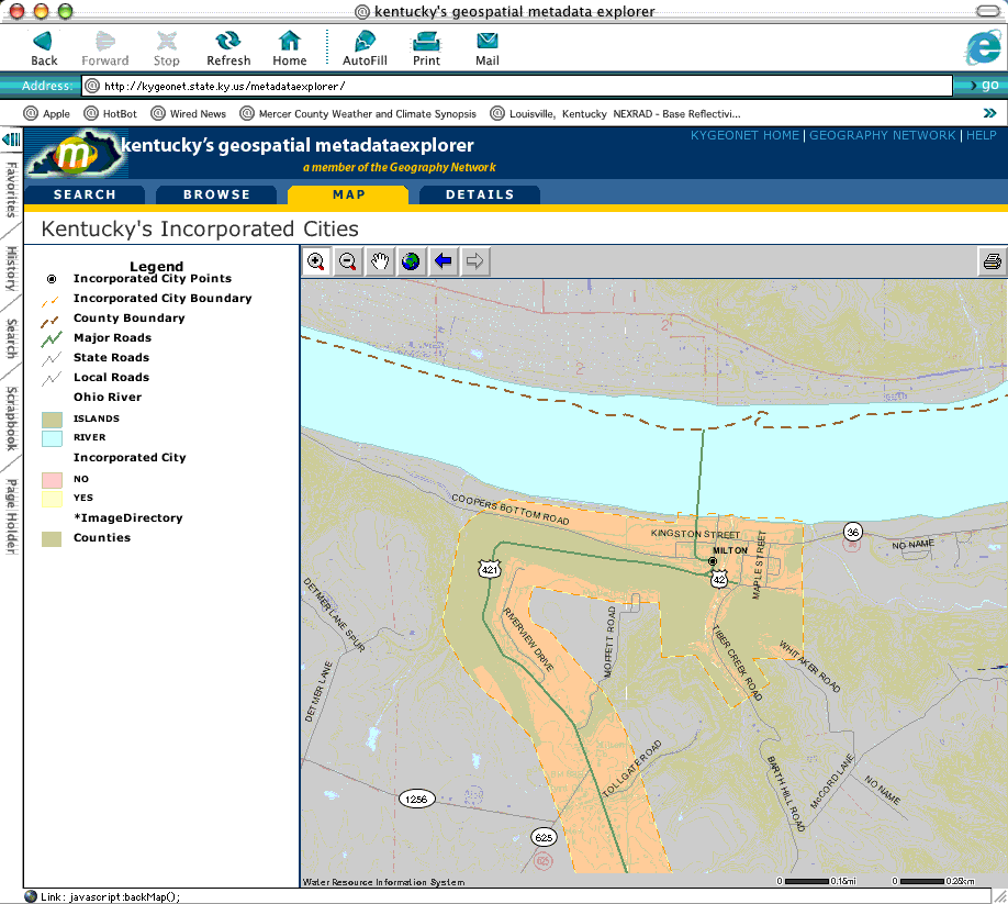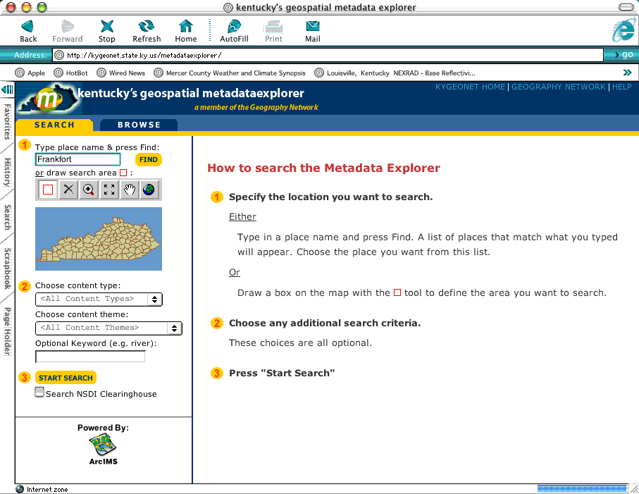 Over the past few years there was much discussion regarding the establishment of a Kentucky geospatial data clearinghouse but most implementation options were resource intensive, not dynamic, and offered little in terms of user experience. Representatives from the Governor's Office of Technology and the Kentucky Geographic Information Advisory Council (GIAC) recognized the need to make the clearinghouse a reality. In April of 2002, a core group consisting of KYOGI, KGS, WRIS, and NREPC met to discuss what it would take to make a clearinghouse happen. Collectively, they decided that ArcIMS Metadata Services, newly available with the release of ArcIMS 4, should be leveraged to establish a clearinghouse. Several state agencies were actively maintaining metadata for the geospatial data available on the Web, and much of this work was being done using the ArcCatalog application in ArcGIS and other FGDC-compliant metadata tools. In addition, there were several ArcIMS services up and running and a wide array of static map images that could be included. Bringing all this rich content together under one metadata service was the solution and Kentucky's Geography Network (KYGEONET) was born. Once Esri's St. Louis regional office learned the Commonwealth wanted to expand data sharing using ArcIMS Metadata Services, Esri offered the on-site technical staff who would assist in setting up services. In preparation, ArcIMS 4 and ArcSDE 8.2 were loaded on dedicated Compaq ProLiant servers running Microsoft IIS 4.0 and Microsoft SQL Server 7.0. An introductory Web page at http://kygeonet.ky.gov/ that greets visitors to the site and acts as a front end to the Metadata Explorer Web page (http://kygeonet.ky.gov/metadataexplorer/) was designed.The required SDE instance was created and Metadata Services were started in ArcIMS 4. KYGEONET was up and running! During the last week of May, Esri staff helped set up the Metadata Explorer JavaServer Pages (JSP) application and customized the gazetteer service specifically for Kentucky. Customizing the Metadata Explorer application so that it had a Kentucky flavor was simple. Using Adobe Photoshop 7 and Macromedia FreeHand 10, appropriate graphics were designed and alterations to the JSP pages were made using Macromedia Dreamweaver MX. These changes gave the site a Kentucky identity without compromising functionality. At this point, KYGEONET was registered with the Geography Network (http://www.geographynetwork.com/). The site was eventually selected as a featured clearinghouse site. A user guide containing information on publishing to KYGEONET is available as an Adobe portable document format (PDF) file to interested parties. After reviewing the guide, users remotely connect to the metadata server using ArcCatalog 8.2, locally select the item to publish, review the metadata to ensure all required fields have been populated, make a thumbnail image using a tool available at the site, and simply copy the item to the appropriate content theme folder on the metadata server. The service parses a subset of the metadata XML file to perform a validation on required fields and keywords prior to being written to the metadata SDE instance. Indexing occurs each time an item is published to the service. Most issues that publishers have encountered relate to errors that occur when entering keywords or geographic extent values.