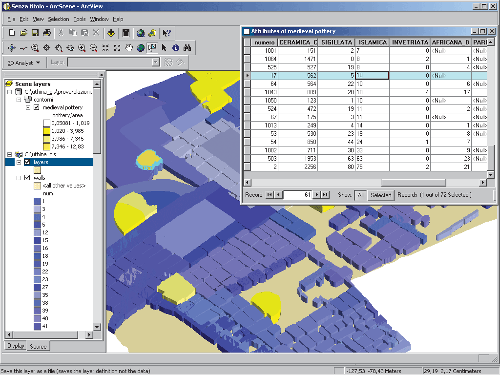 In summer 2002, a GIS application was developed for the project. The application works on an Intel Pentium 4 computer with a 2 GHz processor and 256 MB of RAM running Microsoft Windows XP. It was created in ArcGIS 8.2 and uses the ArcGIS 3D Analyst extension. The stratigraphic unit (SU), the smallest unit recognizable during archaeological excavations, serves as the key for topographic data acquisitions and the relational database. Each SU has a numeric keycode that addresses the analytical data or classification.